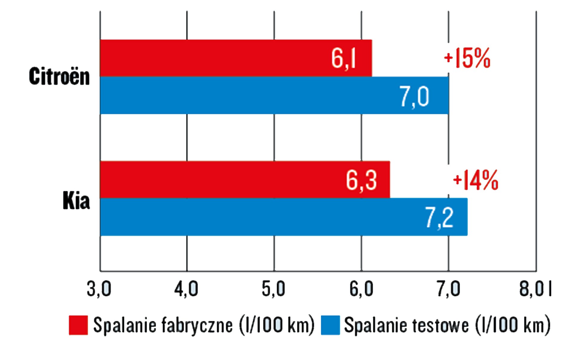 Testowe kontra katalogowe zużycie paliwa (różnica nie jest oceniana)