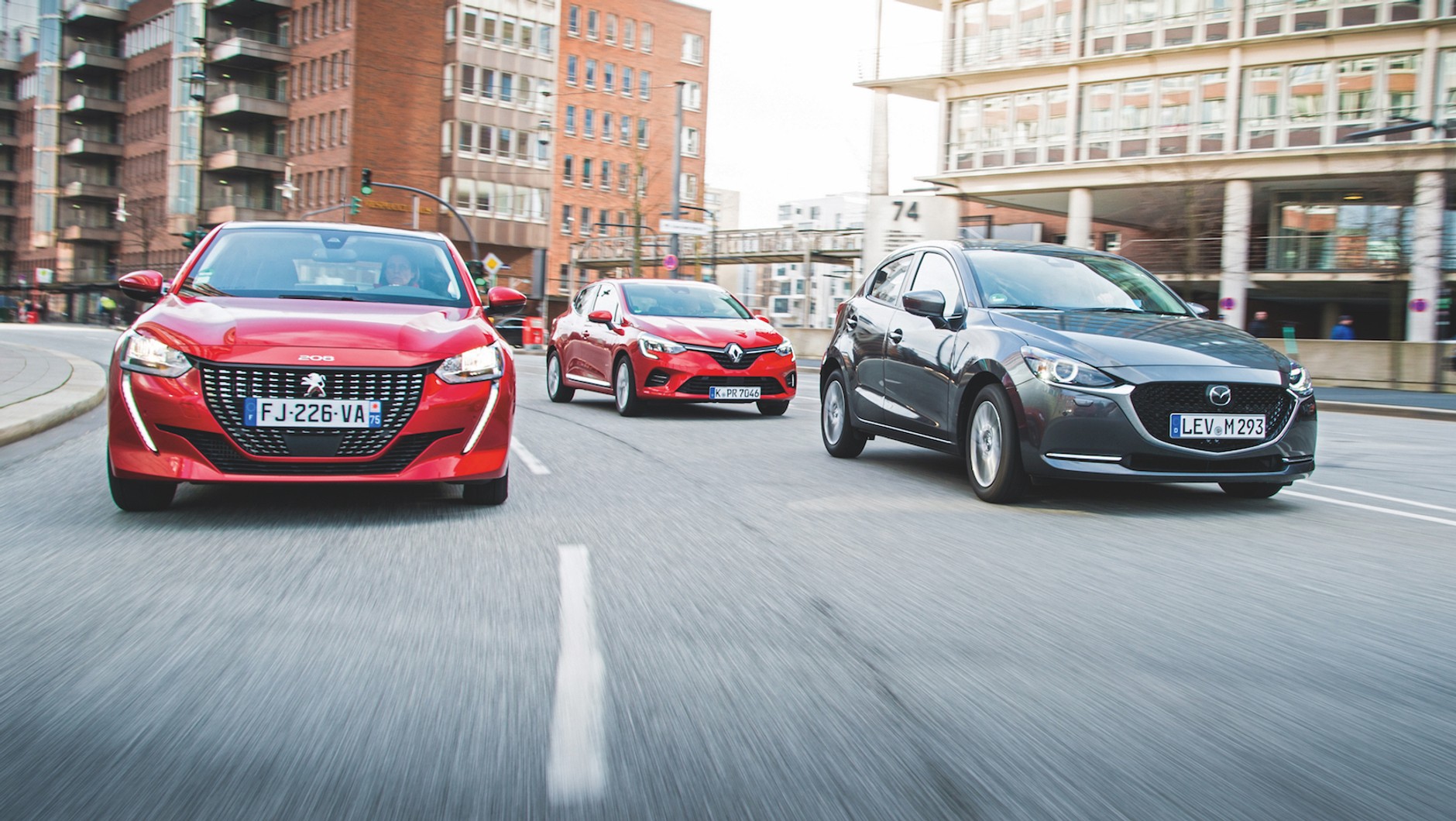 Dwie nowości i jeden odnowiony: Peugeot 208 i Renault Clio są zupełnie świeże, natomiast Mazda 2 niedawno przeszła lifting.
