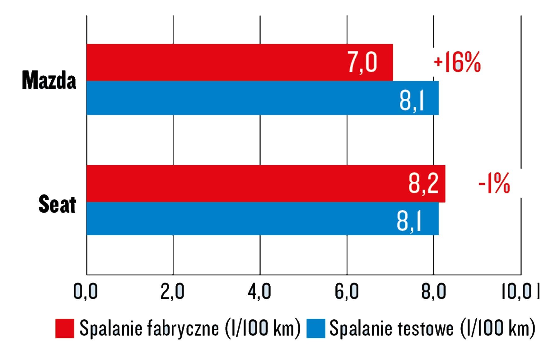 Testowe kontra katalogowe zużycie paliwa (różnica nie jest oceniana)