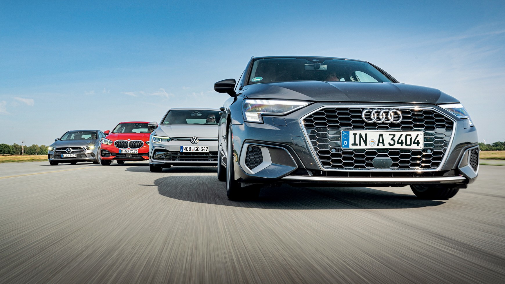 Audi A3 Sportback 35 TFSI, BMW 118i, Mercedes A200, Volkswagen Golf 1.5 eTSI - wyniki pomiarów drogowych (oceniane)