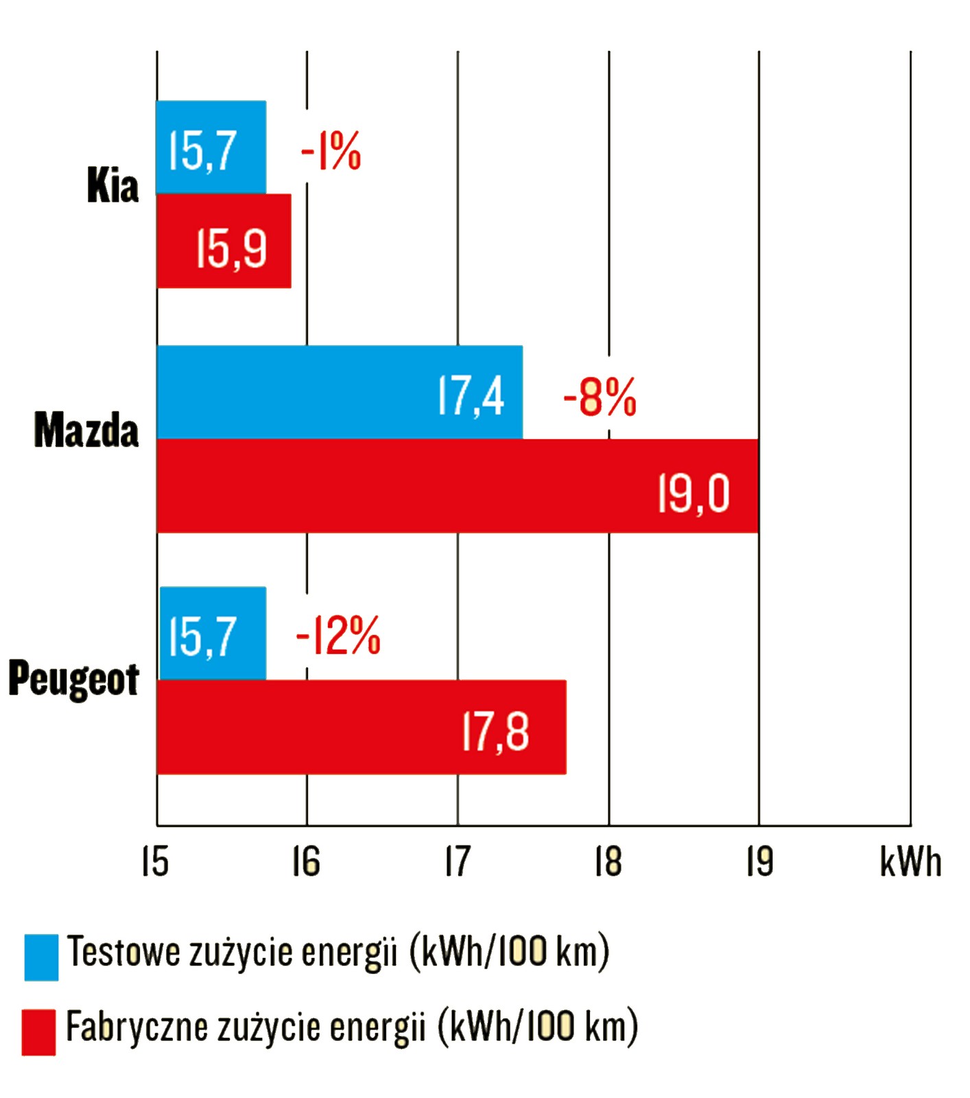 Szacunek! Wszystkie testowane samochody zużyły w naszym teście mniej energii, niż deklarują to ich producenci według standardowej procedury WLTP. Kia trafiła niemal w punkt i wraz z Peugeotem zużyła najmniej, co w przypadku koreańskiego auta zasługuje na najwyższe uznanie, bo ma ono znacznie lepsze osiągi. Maździe trik z niewielkim akumulatorem nie przynosi korzyści: zasięg bardzo mały, a auto dość ciężkie.