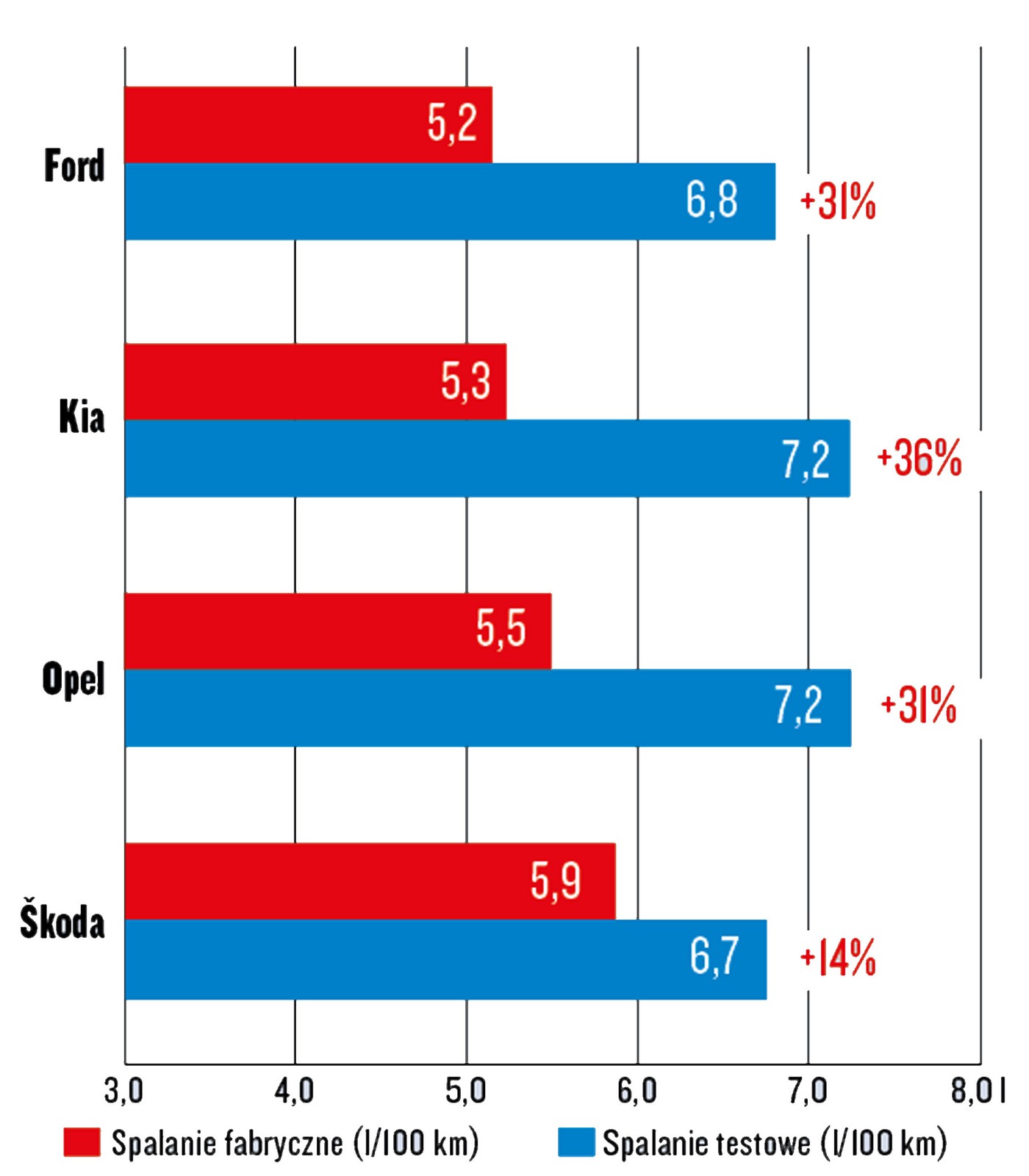 Testowe kontra katalogowe zużycie paliwa (różnica nie jest oceniana)