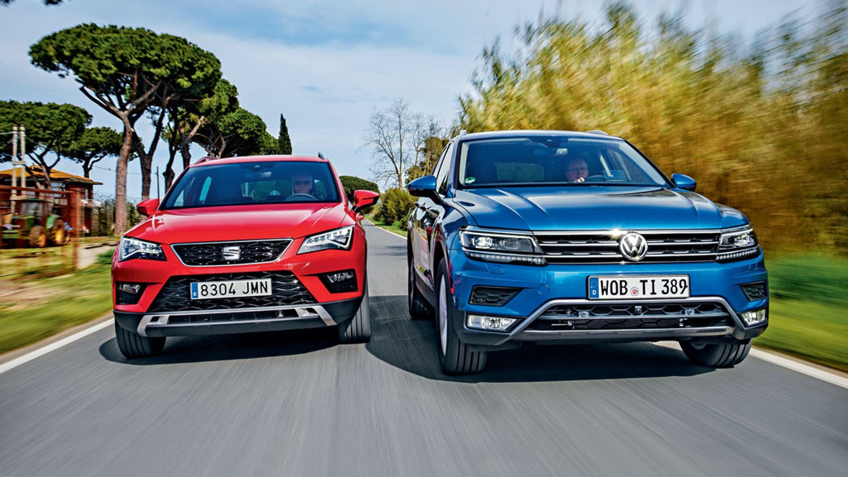 Dopiero teraz pojedynek Hiszpania – Niemcy mógł stać się interesujący, ponieważ swoim nowiutkim modelem Ateca Seat po raz pierwszy odważył się wejść do segmentu SUV-ów, w którym aktualnie toczą się ciężkie walki. Tu musiał wystąpić przeciwko nowemu Tiguanowi. Pojedynek jest interesujący również dlatego, że oba samochody mają podobne rozwiązania techniczne. Oba wykorzystują modularną platformę MQB, na której podróżują liczne pojazdy z koncernu Volkswagena, takie jak VW Golf i Passat. Ta elastyczna platforma samochodowa pozwala nie tylko na różne opcje oddalenia osi, ale również rozstawu kół. I właśnie tak jest w tym przypadku. VW Tiguan i Seat Ateca mają różne rozstawy kół i osi.