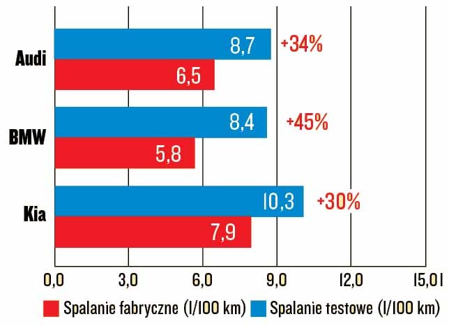 Niech wreszcie w katalogach pojawią się dane o spalaniu według procedury WLTP, bo... Przecież tego się już nie da czytać! O 45 proc. wyższe spalanie testowe od katalogowego – jak w przypadku BMW – to wstyd, tylko nie wiadomo, dla kogo większy: legislatora cyklu NEDC czy producenta samochodu. Kia i Audi notują znacznie mniejsze różnice. Jednak zwycięzcą jest A5, bo Stinger w teście wysysa benzynę jak smok.