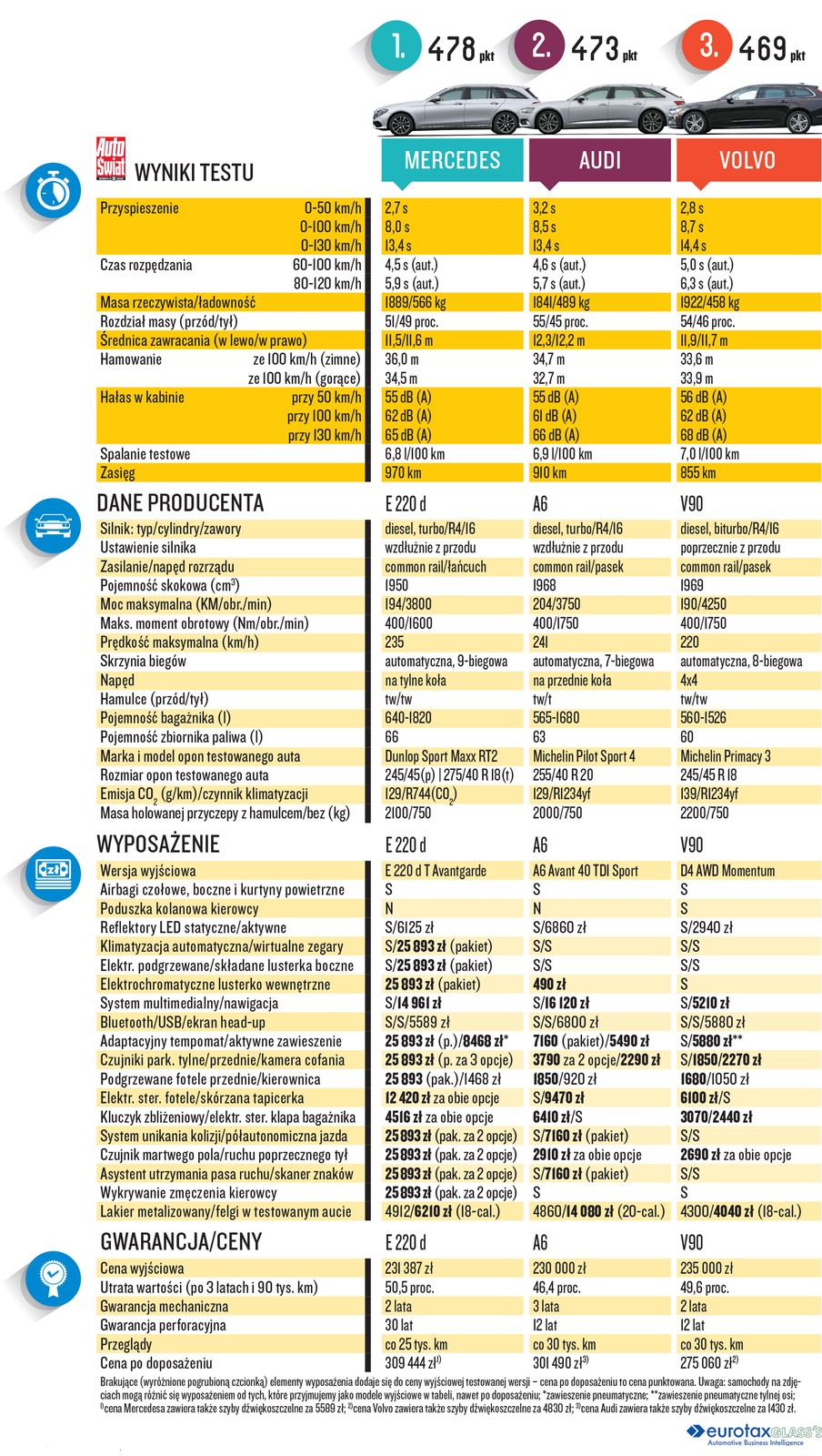 Audi A6 40 TDI kontra Mercedes E 220 d i Volvo V90 D4 - punktacja