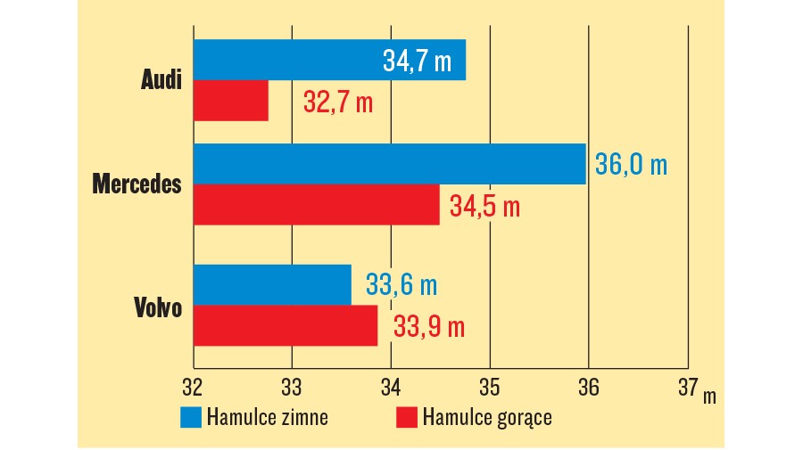 Audi A6 Avant jako jedyny w porównaniu ma z tyłu zamontowane lite tarcze hamulcowe, podczas gdy Volvo i Mercedes – wentylowane. A mimo to Audi po rozgrzaniu tarcz zatrzymuje się z prędkości 100 km/h na mniej niż 33 metrach. Volvo na zimno lepiej hamuje, a na ciepło gorzej, ale średnia droga hamowania niewiele różni się od tej w Audi. Musimy jednak nadmienić, że w Volvo czucie hamulca wydaje się bardziej sztuczne, to samo dotyczy układu kierowniczego. Także z tego względu plasuje się za niemieckimi rywalami pod względem zwinności i prowadzenia.