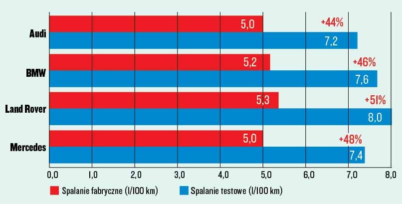 Spodziewacie się superoszczędnych diesli? Nic z tego. To ciężkie samochody z napędem 4x4, a nadwozia o znacznym oporze powietrza z pewnością nie poprawiają ekonomiki jazdy. O ile jednak spalanie 7,2-8,0 l/100 km da się przełknąć, o tyle różnicę między spalaniem katalogowym a testowym – już niekoniecznie.