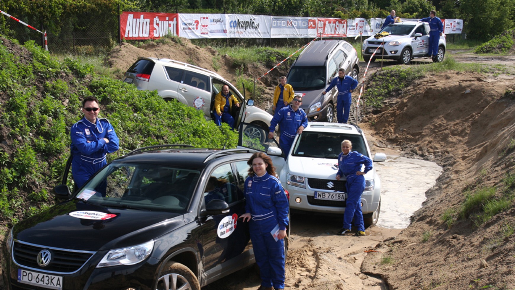 5. Kia.Jeżeli ktoś miał jakiekolwiek wątpliwości, czy SUV-y mogą poruszać się w terenie, to po tej części testu wątpliwości zostały rozwiane. Suzuki Grand Vitara pokazało, że w tej klasie samochodów nie ma sobie równych podczas pokonywania bezdroży. Wszystkie oceniane kategorie padły łupem japońskiego SUV-a. O przepaści, jaka dzieli ten model od pozostałych, niech świadczy różnica punków. Suzuki uzyskało 416 punktów, podczas gdy druga w tej części Kia zdobyła ich 388. Trzeba przyznać, że Sportage dzielnie walczył z Grand Vitarą. Koreański SUV przegrał wprawdzie z Suzuki, ale w porównaniu z pozostałymi rywalami okazał się bezkonkurencyjny. We wszystkich kategoriach zdobył więcej punktów niż Ford, Citroën oraz VW. Największym przegranym po jeździe w terenie okazał się Ford, który w porównaniu z konkurentami został najsłabiej oceniony pod względem ruszania pod górę, wykrzyżowania osi i trawersowania.Stawka wyglądała następująco: