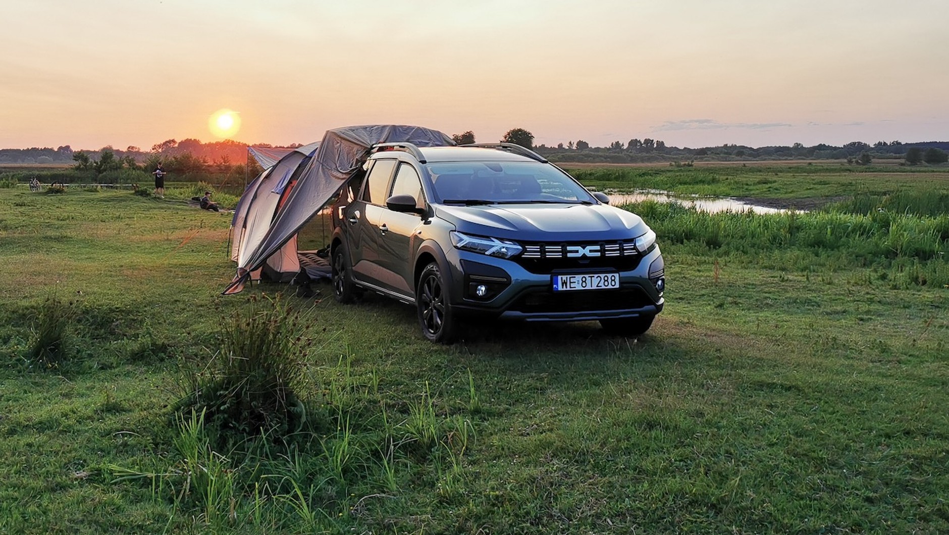 Tymczasem mając w kufrze pełne wyposażenie kamperowe Dacii, wyładowujemy się na łące w sąsiedztwie rzeki. Po pewnym wahaniu zjechałem autem po silnie nierównym polu w dolinę – uznałem, że może się to udać, w końcu auto zawieszone jest dość wysoko i nierówności się nie boi. Udało się i teraz pozostaje znaleźć trochę płaskiego pola. Takie większe "trochę", bo będziemy testować – i to wcale nie "na sucho" – specjalny namiot Dacii kompatybilny z Joggerem. Jest nas czwórka – dwoje dzieci i dwoje dorosłych, a właściwie piątka – jeszcze pies. Jakimś cudem udało się wcisnąć do bagażnika klatkę z czworonogiem.