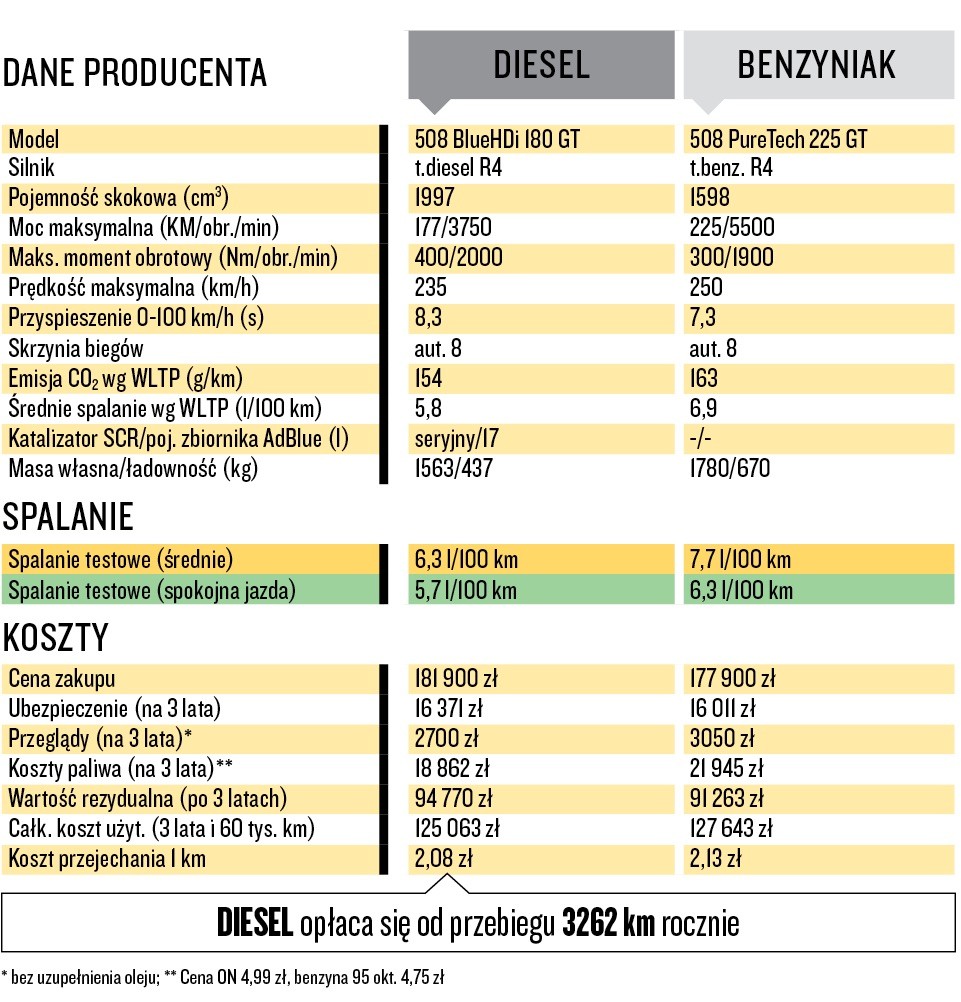 Zakup wersji HDi staje się opłacalny już przy 3262 km rocznie – żaden diesel w tym porównaniu nie „zapracowuje” na siebie tak szybko, jak ten w Peugeocie 508. Koszty podpowiadają zatem diesla, serce głosuje mimo wszystko za mocniejszym i bardziej ekscytującym benzyniakiem. Wybór nie jest łatwy, ale ostatecznie zwycięża racjonalność – jeśli „508-ka”, to jednak z dieslem.