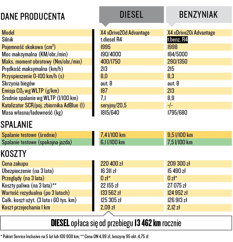 Zasadniczo BMW X4 podróżuje się przyjemnie odprężonym i właśnie dlatego – chętnie dużo i często. Nasza analiza wskazuje na wybór diesla, który ma świetne maniery, mało pali, nawet gdy się go „pogoni”, i stosunkowo szybko zaczyna się opłacać. Jeżeli jednak lubicie dopłacić, to benzyniak na pewno was nie rozczaruje swoimi możliwościami i pasuje do BMW X4.