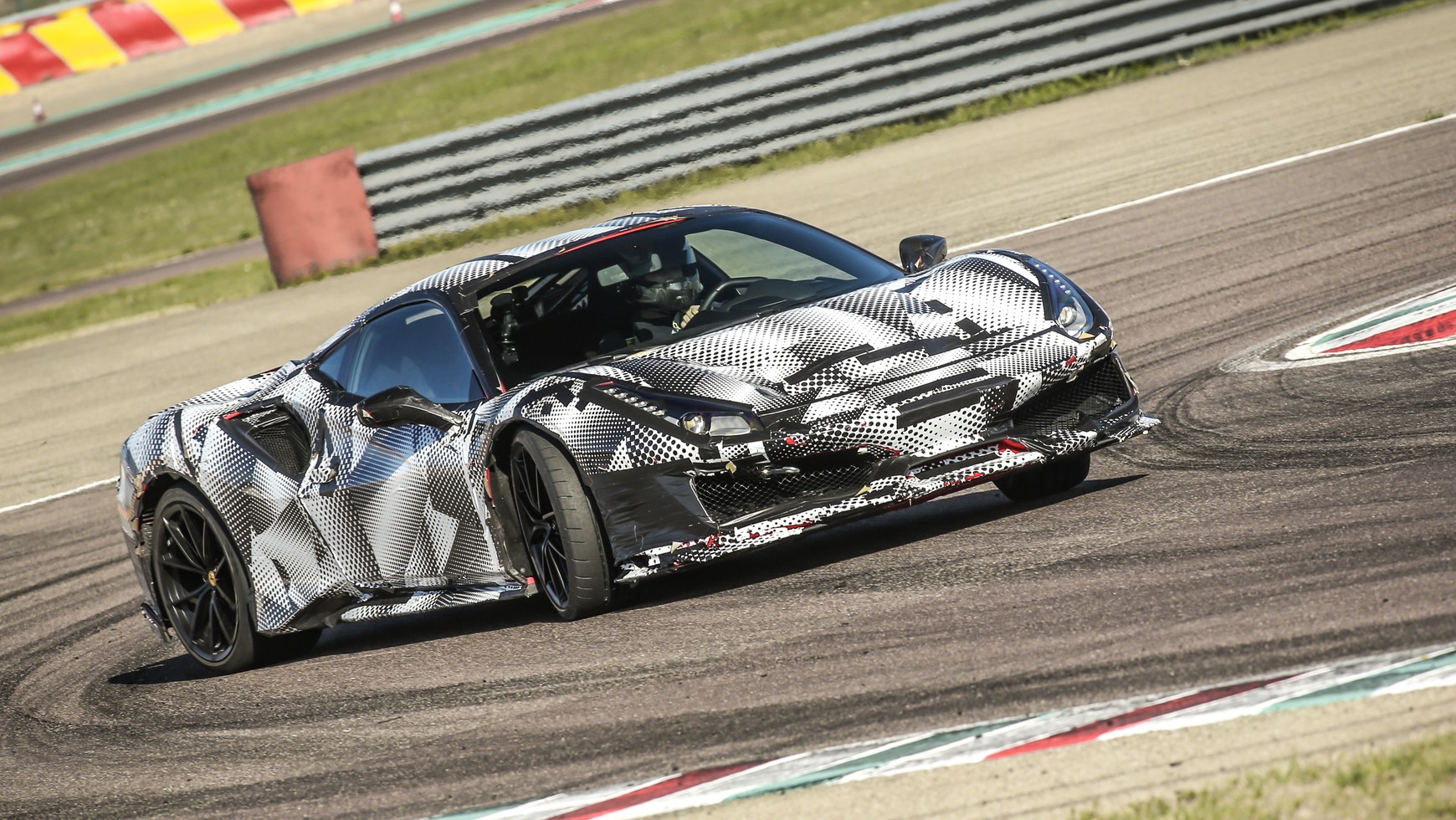 Na prywatnym torze Ferrari przeznaczonym do testowania samochodów pojawiają się kierowcy fabryczni w zakamuflowanych samochodach. Rzeczywiście w takim oklejeniu trudno dostrzec dodatkowe szczeliny w karoserii, które pomagają chłodzić mocniejszy silnik i generują dodatkową siłę docisku.