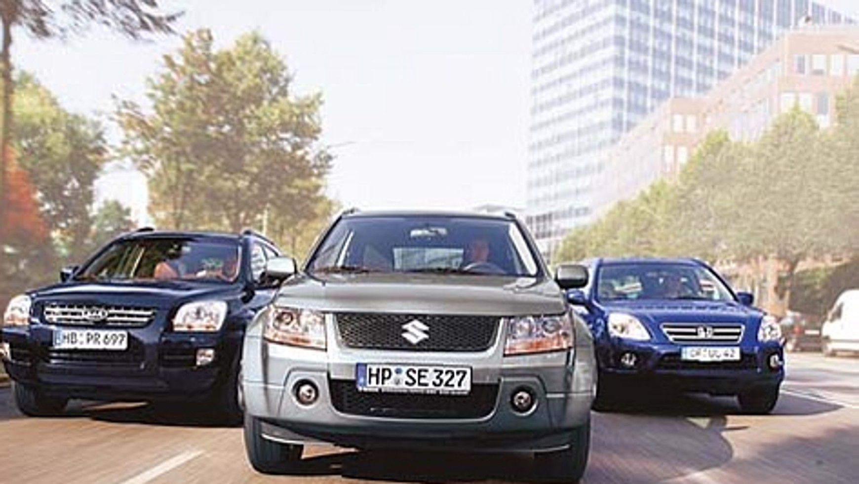 Przestronność/bagażnikNowe Suzuki Grand Vitara z energicznym przodem, klarowną boczną linią i kanciastym tyłem sprawia bardzo korzystne wrażenie - żaden z jego poprzedników nie prezentował się tak dobrze. Przyrządy obsługi i wskaźniki są przejrzyste. Jednak bardziej niż w Hondzie czy Kii czuje się tu, że siedzi się w samochodzie terenowym. Wyrazista środkowa konsola podkreśla charakter wnętrza Grand Vitary. W obu rzędach siedzeń jest wystarczająca ilość miejsca. Tylna dzielona kanapa ma regulowany kąt ustawienia oparcia, można ją także złożyć, ale to wymaga trochę zachodu - jak zrobić to lepiej, pokazuje Kia. W Sportage'u wystarczy jeden ruch ręki, a oparcie kładzie się do przodu, przy jednoczesnym przesunięciu siedziska. W oka mgnieniu powstaje idealnie płaska powierzchnia. Kia przy wielu takich detalach jest zbudowana najbardziej przemyślnie z testowanej trójki. Jako jedyne auto z porównania nie ma na przykład wewnętrznego progu załadunkowego, za to kant zderzaka zaopatrzono w plastikową nakładkę. Dzięki temu nawet ciężki i nieporęczny bagaż można bez problemu i zarysowań włożyć do kufra. Również nie trzeba zwracać przesadnej uwagi na jego masę. Spośród testowanej trójki Sportage oferuje najwyższą ładwoność. Dużo dobrego można powiedzeć także o przestrzeni pasażerskiej. Z punktu widzenia stylistyki znajdziemy tu najwięcej pomysłów, a pod względem materiałów i wykończenia Sportage jest na poziomie CR-V. W środku Kia robi wrażenie tak samo przestronnego samochodu, jak Suzuki. Trzeba jednak zauważyć, że podobną ilość miejsca udało się uzyskać pomimo tego, że Kia jest o około 10 cm krótsza niż Suzuki. Także węższe niż w przypadku Hondy siedzenia upodabniają oba pojazdy do siebie. Honda ma przestronne, ale za to najbardziej funkcjonalne wnętrze. Tak jak u rywali tylna kanapa ma regulowany kąt położenia oparcia, ale można ją też przesuwać wzdłuż osi auta. Także bagażnik Hondy pomieści najwięcej. Tylko pod względem ładowności CR-V oferuje najmniej. Jego podłogę można wyjąć oraz użyć jej jako kampingowego stolika. CR-V okazał się w sumie samochodem dobrze wykonanym, ale w kilku miejscach życzylibyśmy sobie trochę lepszych materiałów tapicerskich. Warte zauważenia są ciekawie zaprojektowane podświetlenia zegarów oraz wkomponowana w centralną konsolę dźwignia hamulca ręcznego. Dzięki takiemu rozwiązaniu między przednimi fotelami jest równa powierzchnia oraz sporo wolnej przestrzeni. Auta terenowe wyposażone w napęd na cztery koła wydają się być idealnymi pojazdami do holowania ciężkich przyczep. A pod tym względem dobrze wypada tylko SUV Suzuki (1850 kg). Kia i Honda oferują zaledwie możliwości uciągu zbliżone to aut klasy średniej. Silnik/skrzynia biegówSuzuki jest oferowane z dwoma silnikami benzynowymi - 1.6 o mocy 106 KM w wersji 3-drzwiowej i testowaną 140-konną "dwulitrówką". Na wiosnę ofertę zasili diesel 1.9 (129 KM) z Renault. Dwulitrowy motor benzynowy nie daje radości z jazdy. W porównaniu z konkurencją opornie wkręca się na obroty i nie ciągnie, jak trzeba. Do prędkości 50 km/h pozostaje cichy, powyżej poziomem hałasu przewyższa rywali. Dzieje się tak do momentu, gdy auto nie osiągnie prędkości 130 km/h. Wówczas cała testowana trójka nie jest przyjemna dla uszu podróżujących. Temperamentem nie zachwyca również jednostka napędowa Kii. Wprawdzie okazuje się nieznacznie dynamiczniejsza od Suzuki podczas sprintu do "setki", ale w codziennym użytkowaniu 0,4 s nie są odczuwalne. W dodatku Sportage przegrywa z obydwoma konkurentami w dziedzinie elastyczności, zwłaszcza na najwyższym biegu. 2-litrówka Hondy to zupełnie inna szkoła. Po pierwsze ma najwyższą moc, a po drugie jej silnik ma do czynienia z najmniejszą masą pojazdu. Ten 150-konny motor potrafi wszystko lepiej. Charakteryzuje się wyższą kulturą pracy, jest cichszy i nie robi wrażenia przeciążonego. Żaden z konkurentów tak przyjemnie nie wkręca się na obroty. W rezultacie ma także lepsze osiągi. CR-V jest dostępny także ze świetnym, 140-konnym turbodieslem 2.2, ale jeśli mielibyśmy określić wzorcową, 4-cylindrową, benzynową jednostkę do tego typu pojazdu, z pewnością byłby to silnik Hondy. Zawieszenie/hamulceSuzuki wydaje się być samochodem poważniejszym w porównaniu z Hondą CR-V i Kią Sportage. I wrażenie to znajduje potwierdzenie w zastosowanej przez Japończyków technice. Jako jedyna z naszego trio Grand Vitara stąpa twardo po ziemi, co w tłumaczeniu na język off-roadowy oznacza standardowo przełożenie terenowe oraz blokadę mechanizmu różnicowego. Nic więc dziwnego, że poza utwardzonymi drogami Vitara ma całkiem spore możliwości. Na asfalcie Suzuki jest posłuszniejsze poleceniom kierowcy niż obydwaj konkurenci - wszystko dzięki twardszemu zawieszeniu i precyzyjniejszemu układowi kierowniczemu. Ale coś za coś - na poprzecznych nierównościach (np. pęknięciach asfaltu) z układu jezdnego wydobywają się stuki. Sportage resoruje podobnie jak Suzuki, tyle że jest trochę miększy. Mimo tego nie osiąga jego lekkości. Prowadzi się co prawda posłusznie, ale trochę bardziej opornie. Winę za to ponosi przede wszystkim nieprecyzyjny układ kierowniczy. Hondą jeździ się spokojnie i bez wysiłku, przy jeszcze bardziej komfortowym resorowaniu niż w Kii i Suzuki. Ale jej nadwozie przy szybkiej jeździe mocno się wychyla. Niezależnie od temperatury tarcz CR-V ze 100 km/h do zera zatrzymuje się na dystansie poniżej 40 m. Przy zimnych hamulcach najwcześniej zatrzymuje się wprawdzie Suzuki, ale po wzroście temperatury droga hamowania wydłuża się aż o 2 m. Kia potrzebuje najwięcej miejsca na zatrzymanie się przy zimnych hamulcach, a po ich rozgrzaniu plasuje się pomiędzy konkurentami. Cena/wyposażenieCenowo najkorzystniej prezentuje się Suzuki. Jednak w przypad
