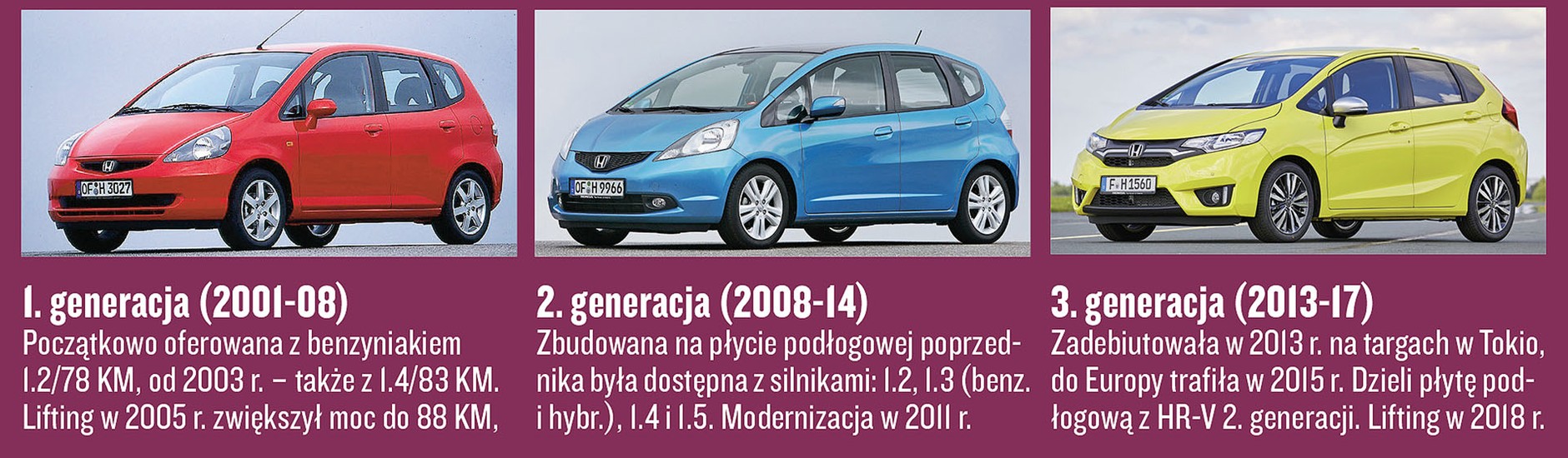 Jazz po raz pierwszy pojawił się w koncernie Hondy w 1981 r. jako wersja hatchback modelu City. Pierwsza generacja oficjalnie zadebiutowała jednak w 2001 roku i od tamtej pory jest oferowana na rynku europejskim. Każdą odsłonę Jazza chwalono nie tylko za praktyczność, lecz także za niezawodność.