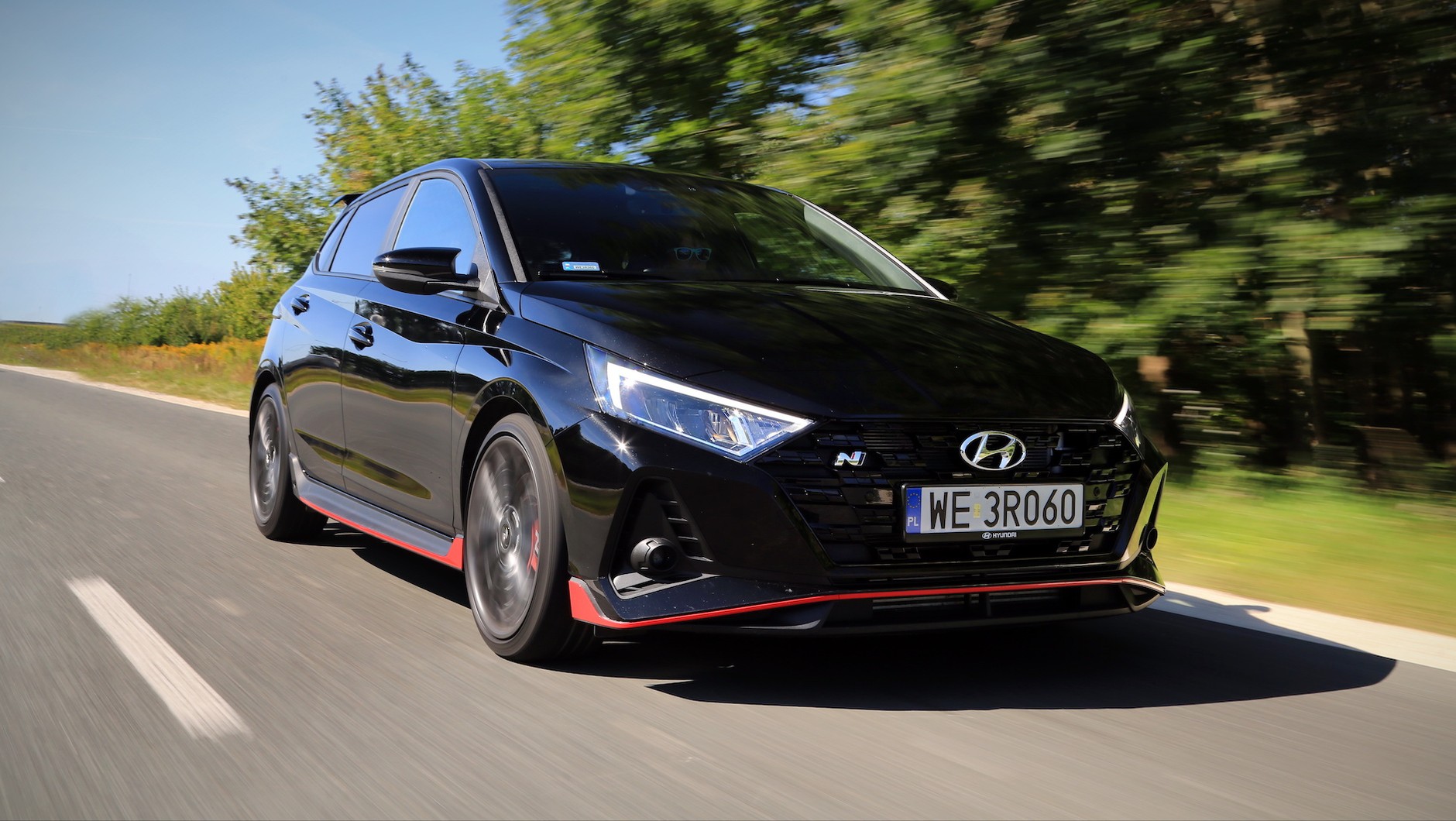 Równie przyjemne wrażenie sprawia wnętrze. Owszem, plastiki na kokpicie i obiciach drzwi są twarde, ale wyglądają bardzo dobrze. Jakość wykończenia także nie budzi zastrzeżeń, a tapicerka wykonana jest z połączenia skóry i materiału. Nie brakuje sportowych akcentów w postaci dobrze wyprofilowanych kubełkowych foteli, chromowanych nakładek na pedałach i drążku skrzyni biegów, przeszyć z logo „N” na zagłówkach czy przycisków „N” na kierownicy, dających błyskawiczny dostęp do najbardziej rasowego trybu pracy układów jezdnego i napędowego. Jest też czerwony guzik „REV”, aktywujący redukcję biegów z międzygazem. Ta z kolei zapewnia nie tylko płynniejszą zmianę przełożeń, lecz także lepsze doznania dźwiękowe. Silnik podbija wtedy obroty, a do uszu dobiega radosne warknięcie z rury wydechowej. Zresztą rasowe, choć wspomagane z głośników basowe koncerty słychać również podczas dynamicznej jazdy w trybie Sport lub N. Da się też dopasować brzmienie do własnych preferencji w programowanych trybach Custom. Podobnie zresztą jak i wygląd cyfrowych zegarów i ekranu systemu multimedialnego (oba o przekątnej 10,25 cala). Do wyboru jest mnóstwo stylów z różnym zakresem informacji, w tym m.in. wykresy mocy, momentu, przeciążeń i wiele innych. Nie brakuje też obsługi Apple CarPlay i Android Auto (wymagane połączenie kablem).