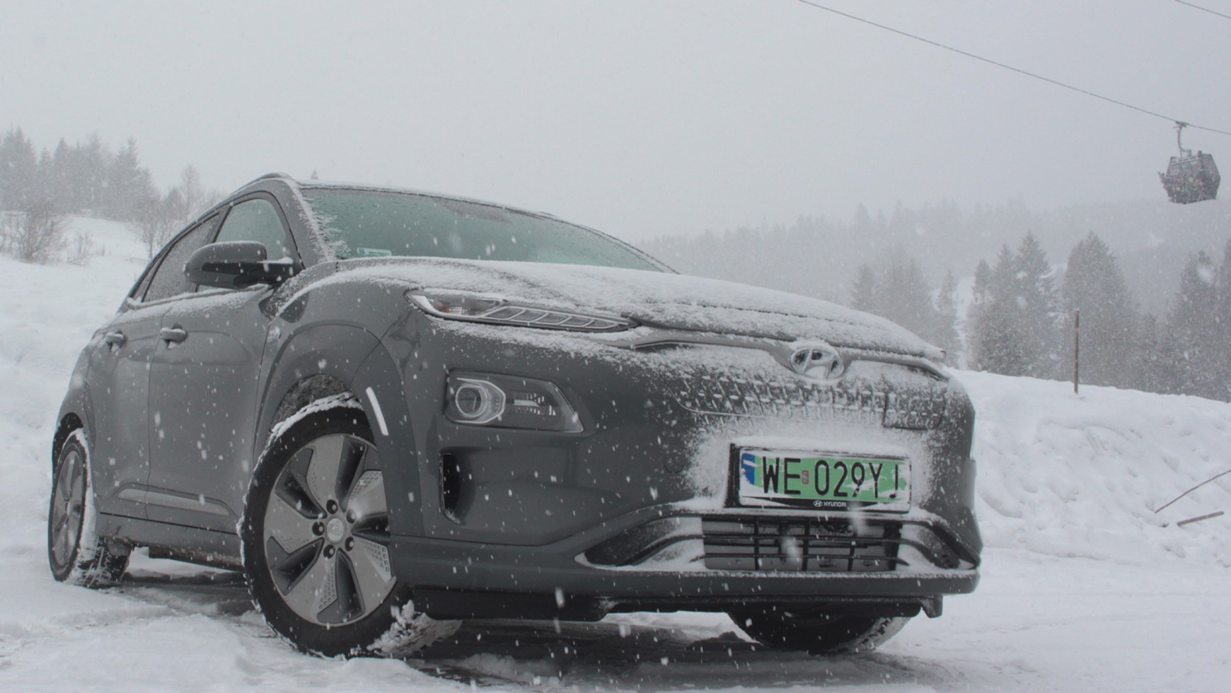Prawdziwa „próba sił” nastąpiła jednak kolejnego dnia, podczas wjazdu na parking przy stoku w Bachledowej Dolinie. Widząc kierowców zawracających lub w popłochu cofających z podjazdu miałem nietęgą minę. Żeby chociaż można było wziąć rozpęd albo wyczarować napęd 4x4 (Kona Electric musi zadowolić się przednim)… Gdy przychodzi nasza kolej ruszamy, ale mimo pedału wciśniętego głęboko auto dostojnie porusza się pod górę. Pierwszy wniosek? Za wolno, nie damy rady! W połowie stoku samochód jeszcze zwalnia, praktycznie do kilku km/h, ale… dzielnie sunie naprzód, takim „mizernym” tempem aż do samej góry – czapki z głów, Hyundai odrobił lekcję pt. „kontrola trakcji”!
