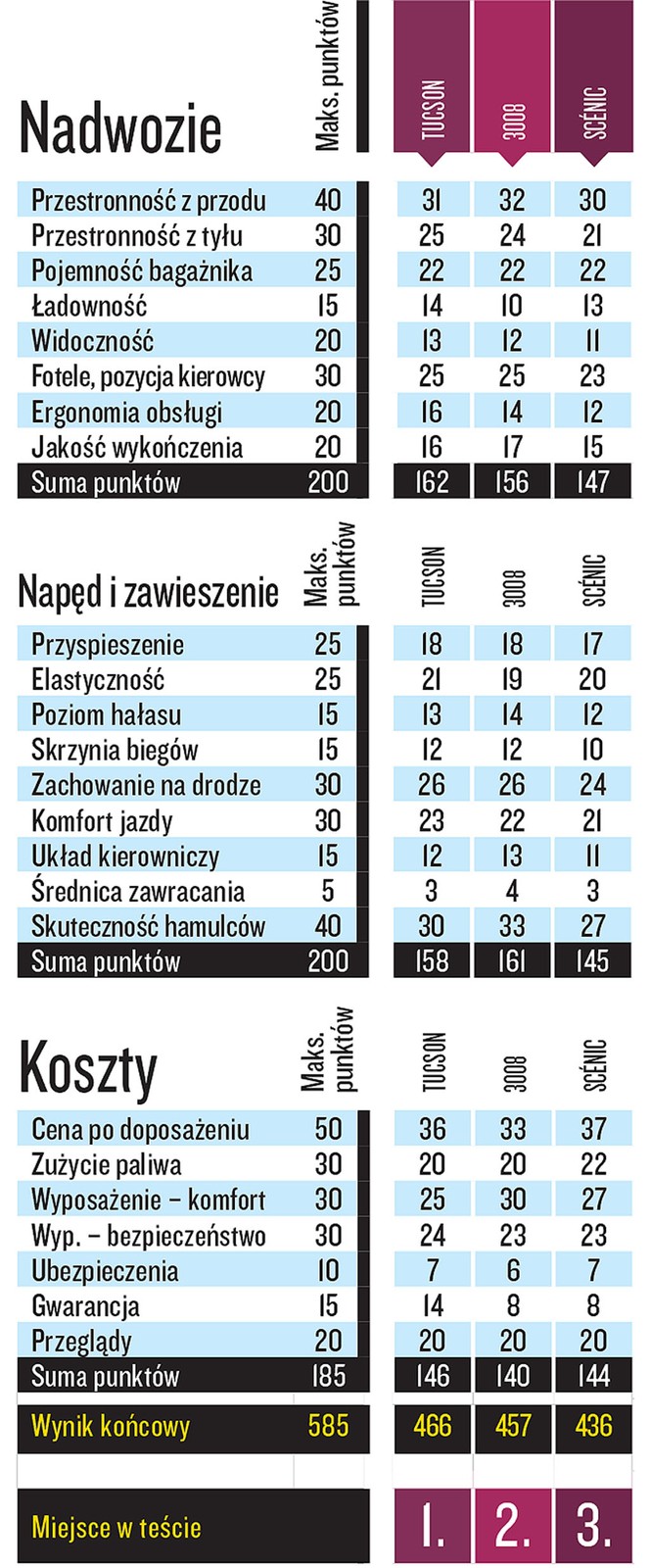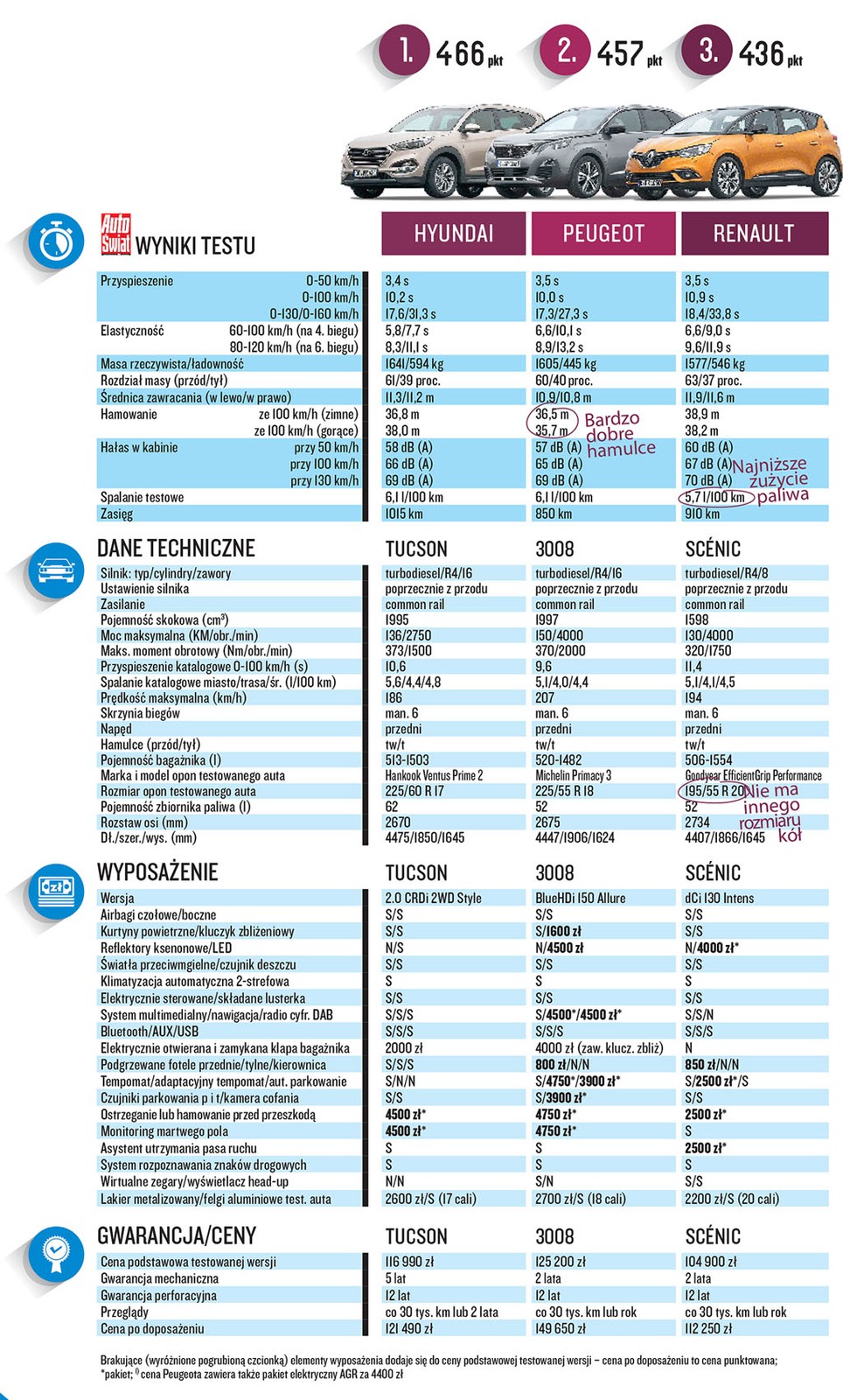 Renault kusi najniższą ceną i bogatym wyposażeniem, jednak kategorię kosztów wygrywa Hyundai, gdyż ma ponaddwukrotnie dłuższą gwarancję niż „francuzi” i stosunkowo atrakcyjnie go wyceniono. Cena Peugeota po dopasażeniu wzrosła do prawie 150 000 zł. Szkoda, bo miał szanse na to, żeby wygrać to porównanie.