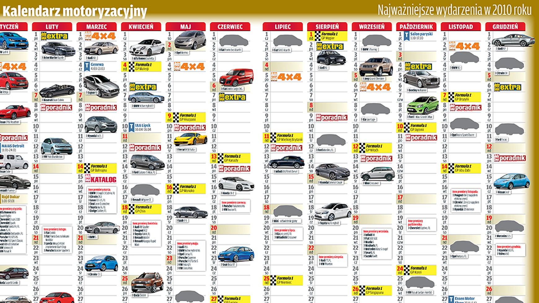 Kalendarz motoryzacyjny na rok 2010 Robert Rybicki 28 grudnia 2009, 01:00 Ściągnij i wydrukuj kalendarz motoryzacyjny 2010 roku!. Auto Świat Kalendarz motoryzacyjny na rok 2010