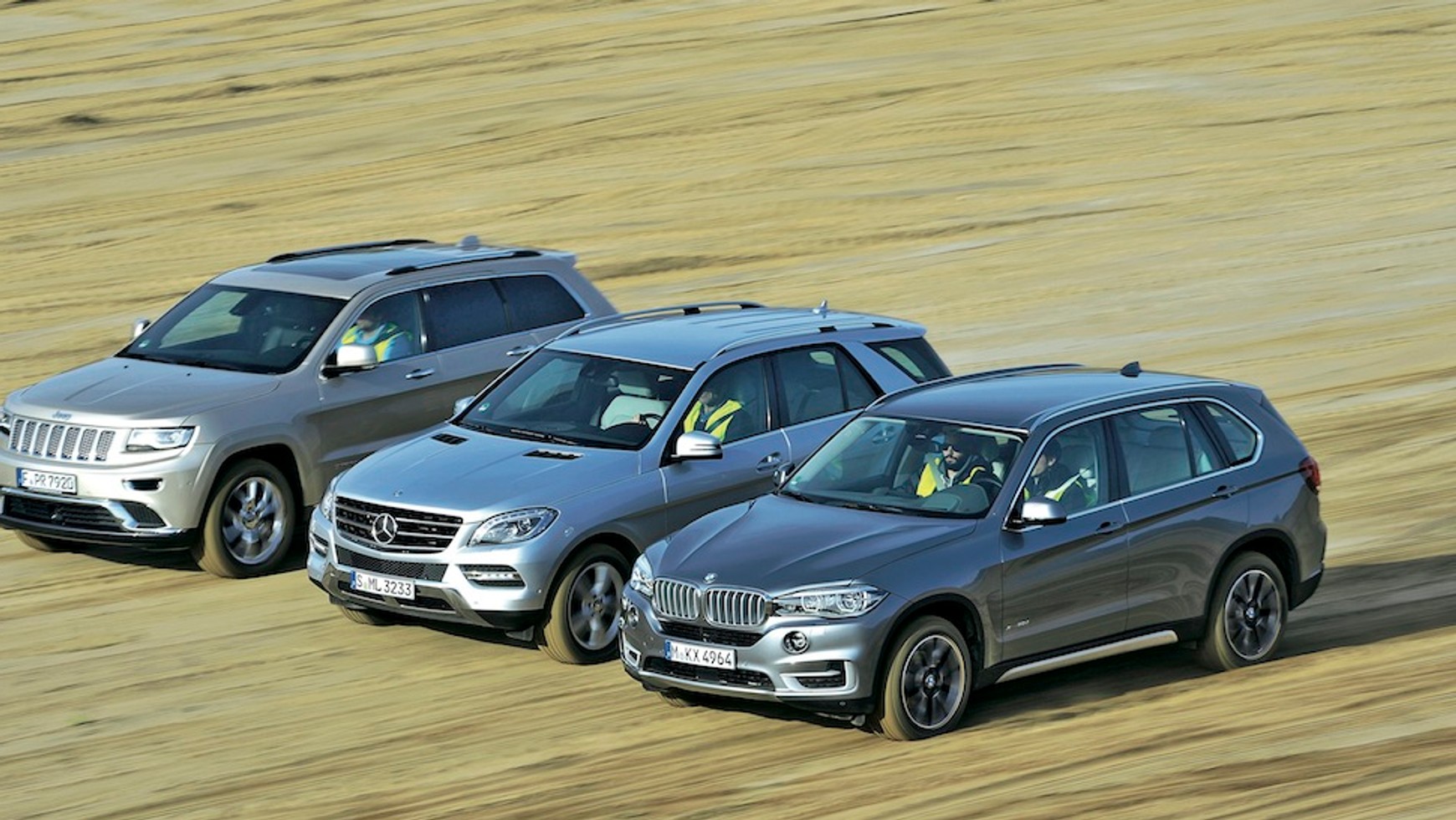 Tak na piaszczystej łasze zaczął się test, w którym do pojedynku stanęły nowe BMW X5, Jeep Grand Cherokee i Mercedes ML. To prawdziwe potwory – każdy z nich ma 5 m długości, 2 m szerokości i ponad 2 t masy. I każdy napędzany jest silnikiem o mocy co najmniej 250 KM.