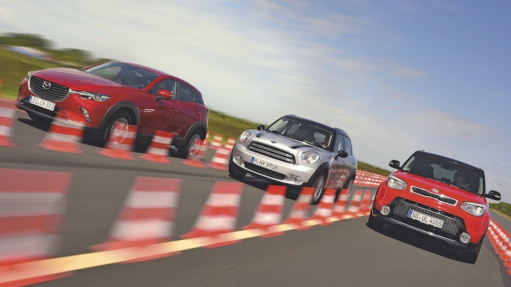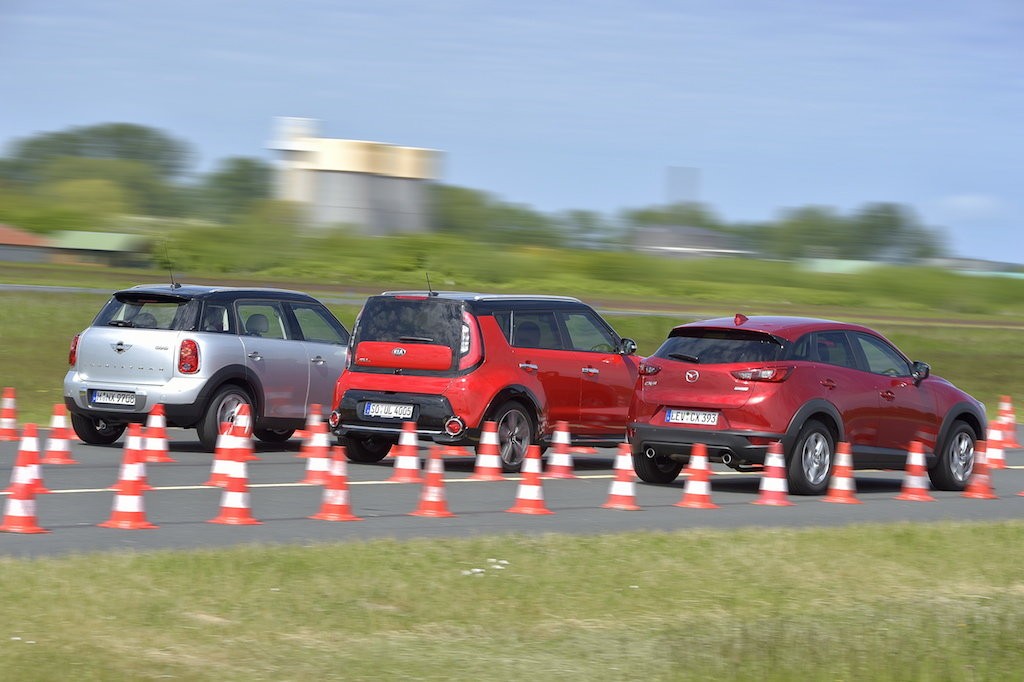 Nastawiony na zwinność Countryman nie zebrał zbyt dużej liczby punktów za komfort, przekonywał jednak świetnym prowadzeniem na zakrętach. W przypadku Kii na punktacji w kategorii „komfort” zaważyły duże, 18-calowe koła, które w czasie jazdy mocno hałasują. Ponadto w opanowaniu pojazdu na zakrętach przeszkadza nieprecyzyjny układ kierowniczy. Atutem Kii okazuje się natomiast krótka droga hamowania – 34,6 m. Mazda potrzebuje na zatrzymanie ze 100 km/h o metr więcej, a Mini niemal o 2 metry.