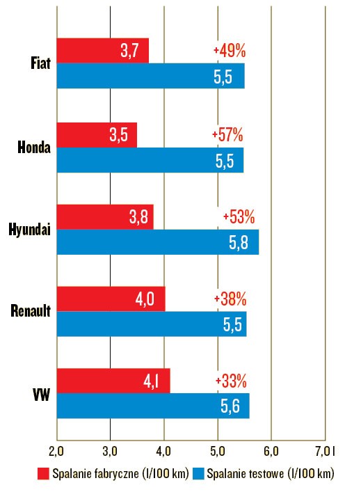 Fiat Tipo vs. Honda Civic, Hyundai i30, Renault Megane i VW Golf - spalanie katalogowe kontra zużycie paliwa zmierzone podczas testu: