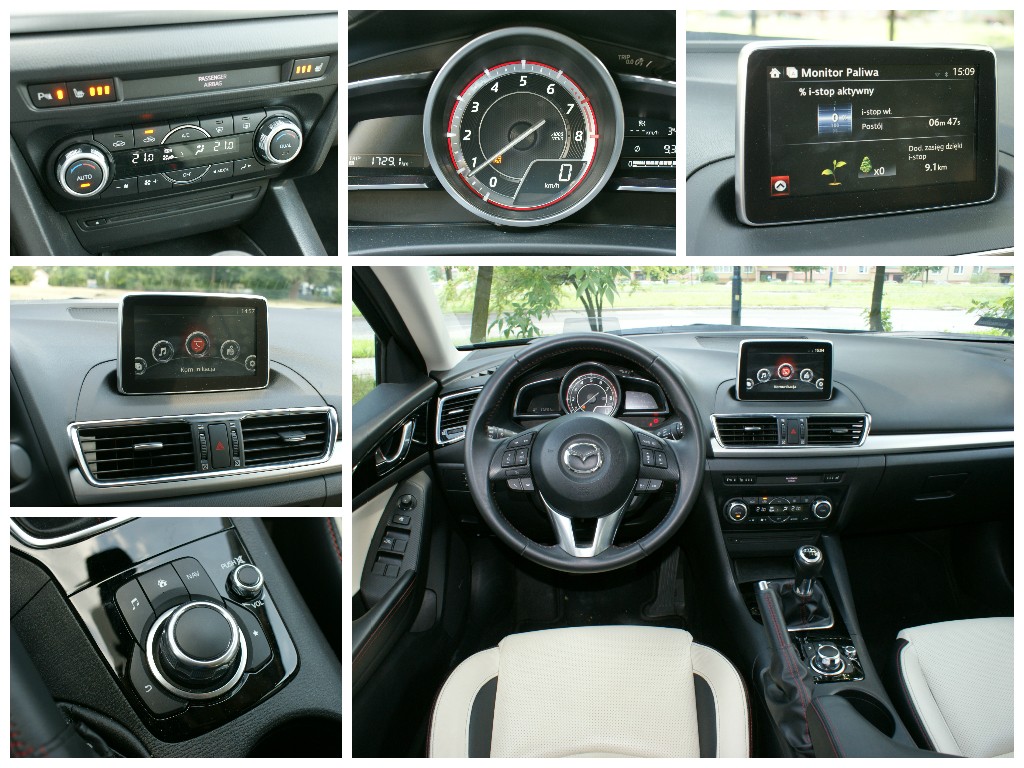 Mazda bogato wyposaża swoje modele, a już w testowanej wersji nie brakowało niemal niczego. Tradycyjnie już dla nowych Mazd świetnie działa obsługa systemu audio i nawigacji. Pokrętło i przyciski na tunelu środkowym pozwalają na intuicyjne poruszanie się po menu. Duży ekran sterczący na szczycie konsoli środkowej jest czytelny i położony na linii wzroku, ale szkoda że nie da się go schować. Obawiam się, że amatorzy cudzej własności mogą obrać go sobie za cel, nawet jeśli nie zrobią później z niego użytku…