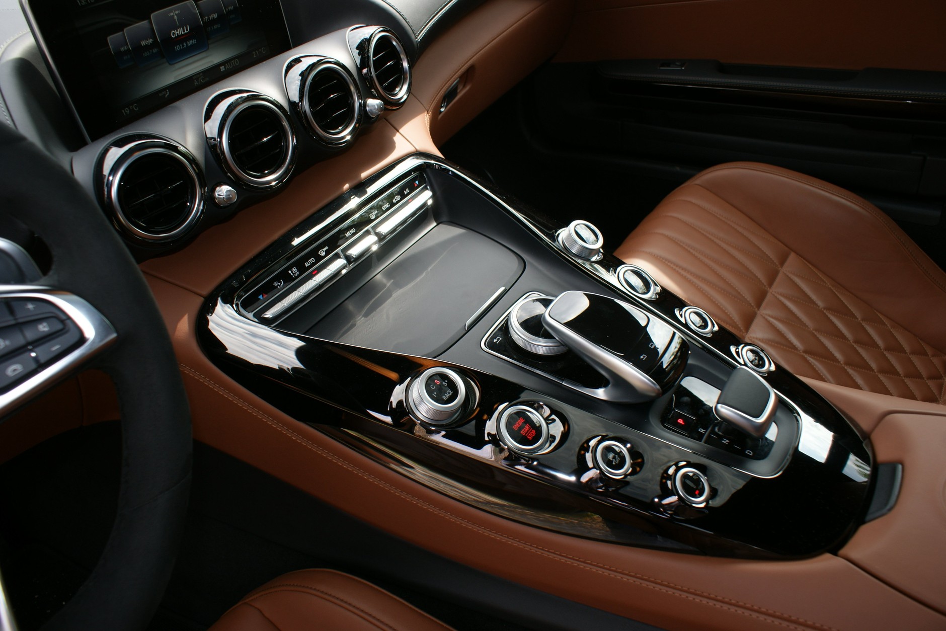 W środku Mercedes-AMG GT prezentuje najwyższą jakość, jeśli chodzi o materiały wykończeniowe. Stylistycznie również bez zarzutu. Jest sportowy charakter, na czele z zamszową kierownicą, która idealnie leży w dłoni i nie ślizga się, nawet kiedy pod wpływem nadmiaru emocji na torze wyścigowym spocą się nieco ręce. W konsoli środkowej dostępne są wszystkie przełączniki związane z trybami jazdy, a powyżej nich znalazła się kontrola klimatyzacji. Pomiędzy nimi z kolei króluje pokrętło i panel dotykowy systemu COMAND. Z kolei duży wyświetlacz górujący nad tym wszystkim nie jest dotykowy, bo i trudno byłoby do niego sięgać w czasie jazdy.