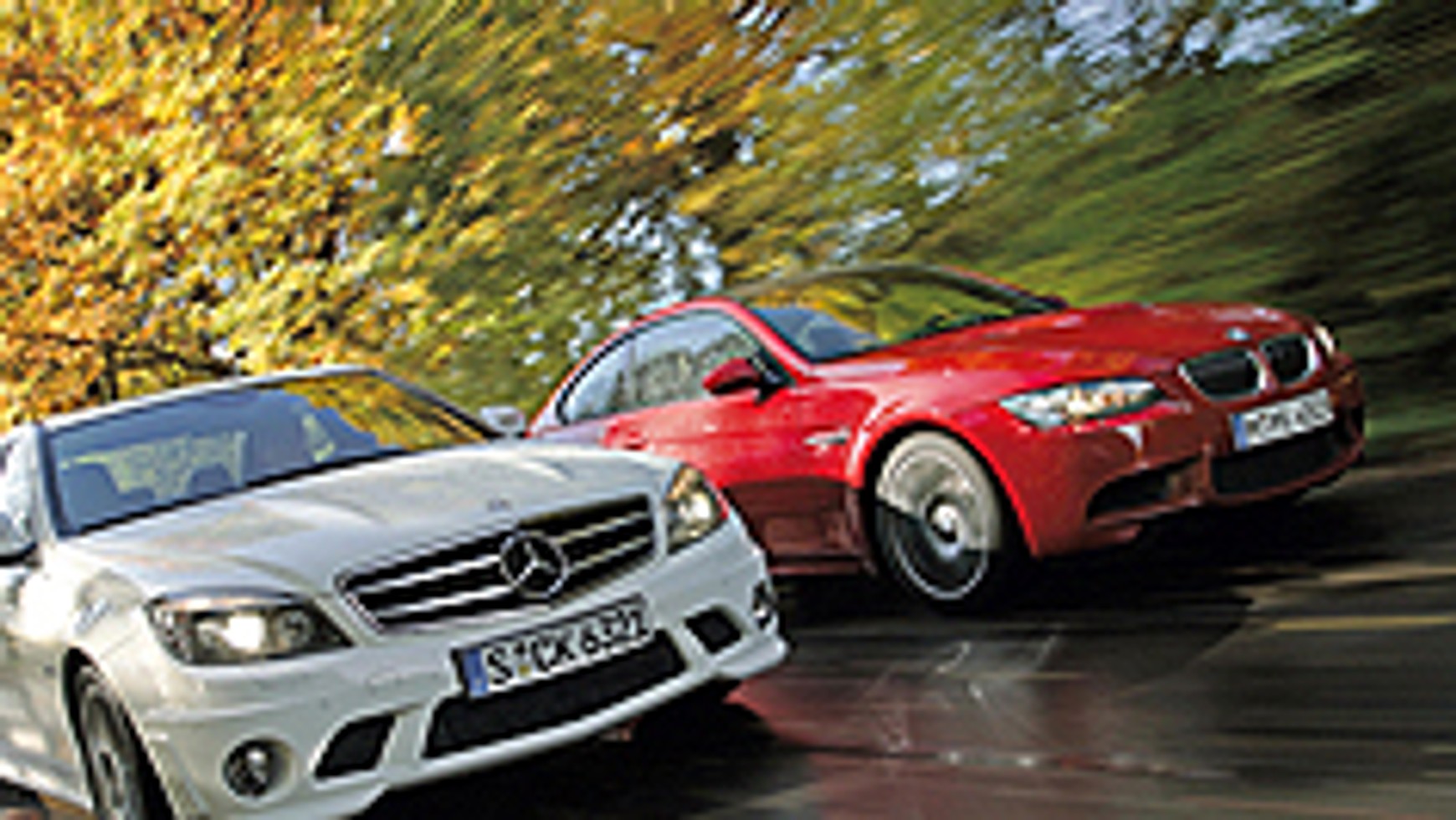 Muskularna karoseria BMW, uwieńczona czarnym dachem z włókien szklanych, powoduje zwiększone wydzielanie hormonów szczęścia już na postoju. W porównaniu z nim Mercedes wygląda przysadziście. Oczywiście, nadwozie czterodrzwiowego C 63 jest praktyczniejsze od dwudrzwiowego konkurenta, ale jednocześnie wygląda mniej rasowo. Już po pierwszym przekręceniu kluczyka trudno się oprzeć AMG. Silnik 6,2 litra odzywa się jak wulkan tuż przed wybuchem. Ośmiocylindrowy bas wywołuje gęsią skórkę i przyjemne mrowienie w żołądku. Pomimo hymnów, jakie wygrywa ośmiocylindrowiec M3 na wysokich obrotach, melomani na pewno wybiorą dźwięk pracy silnika C 63 AMG. Nasi "sportowcy" muszą mieć niezwykłe osiągi. Rzut oka na tabelę z wynikami testu obydwu aut zapiera dech w piersiach, przy czym Mercedes okazuje się lepszy od BMW.