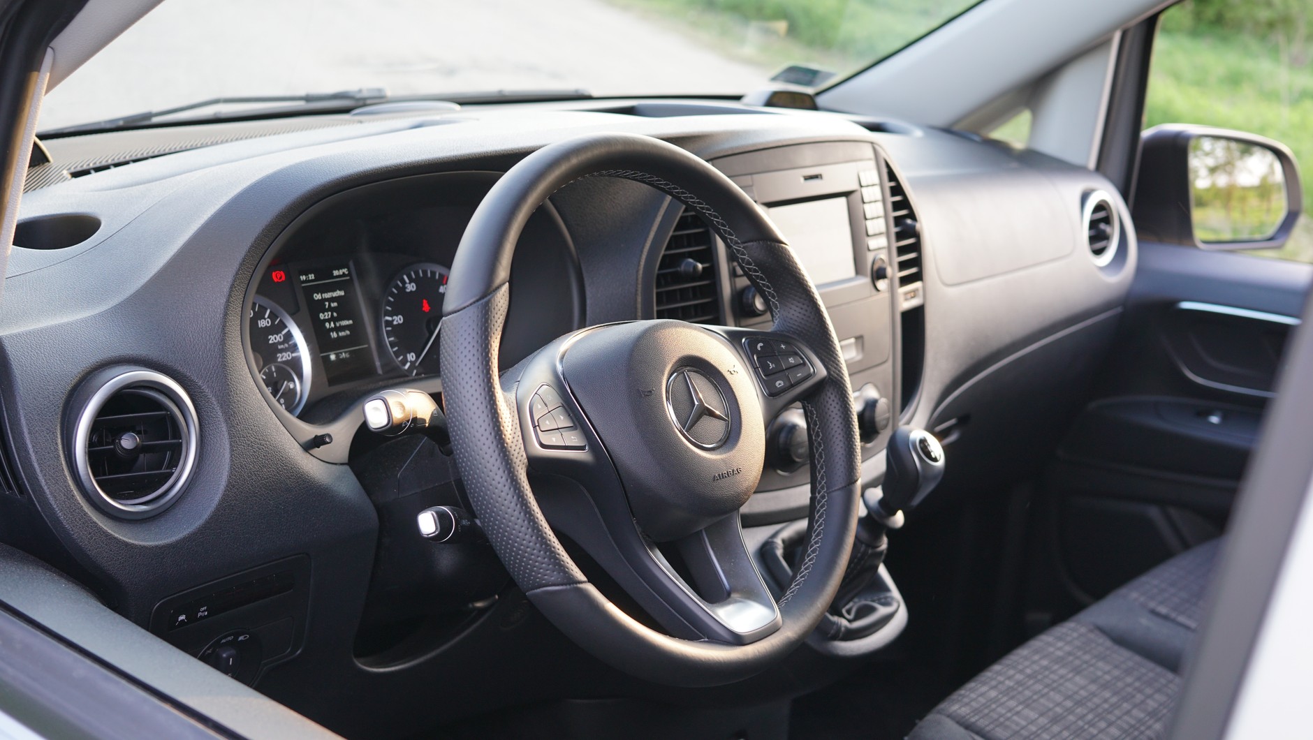 ...ten przede wszystkim jest śpiący. Pobudka o 5.30, o 9.00 trzeba być w Białymstoku, aby odebrać panele słoneczne. Szybki prysznic, jeszcze szybsza kawa i lecimy. 70-litrowy zbiornik paliwa (opcja za 277 zł) pokazuje stan zwany „full”. Trochę oczy się kleją. Trochę motoryka nie jest taka jak trzeba, no wiem lata lecą, do tego nie jestem panem Witoldem z pięknym wąsem, który ciśnie Vito bezrefleksyjnie do przodu. Na szczęście Mercedes o tym wiem i wyposaża za dopłatą Vito w gadżety, które akurat o szóstej rano mają znaczenie. Myślę tu przede wszystkim o „Pakiecie asystent jazdy” w skład którego wchodzi np. asystent martwego pola (pamiętam jak debiutował w E klasie W 211 i działał tak sobie), głupio to przyznać, ale się przydaje (znam nowe auta osobowe, w których wciąż nie da się go dokupić). A że jest dość ciepło szybko doceniamy (nie jadę sam) dwustrefową klimatyzację (za bagatela 7,7 tys. zł, coś czuję, że na owocach i warzywach bym tyle nie zarobił).