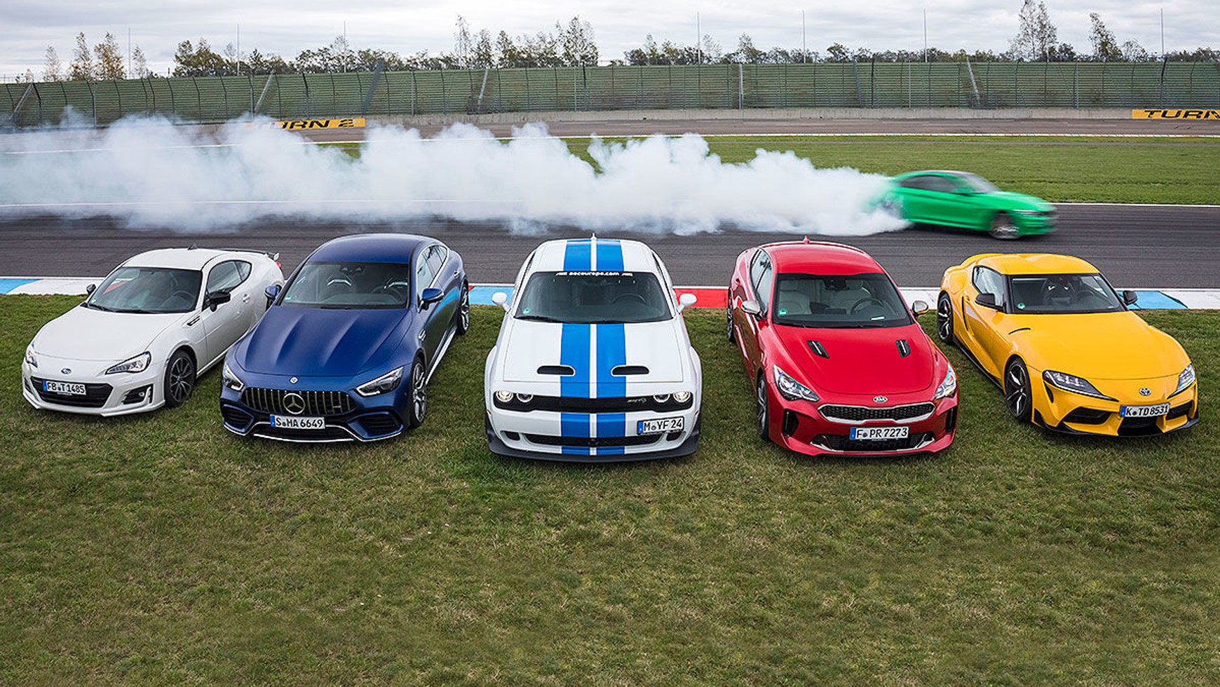 W zmaganiach na torze biorą udział (od lewej): Subaru BRZ, Mercedes-AMG GT 63 S, Dodge Challenger SRT Hellcat, Kia Stinger GT, Toyota GR Supra i (w tle) BMW M4 Competition.