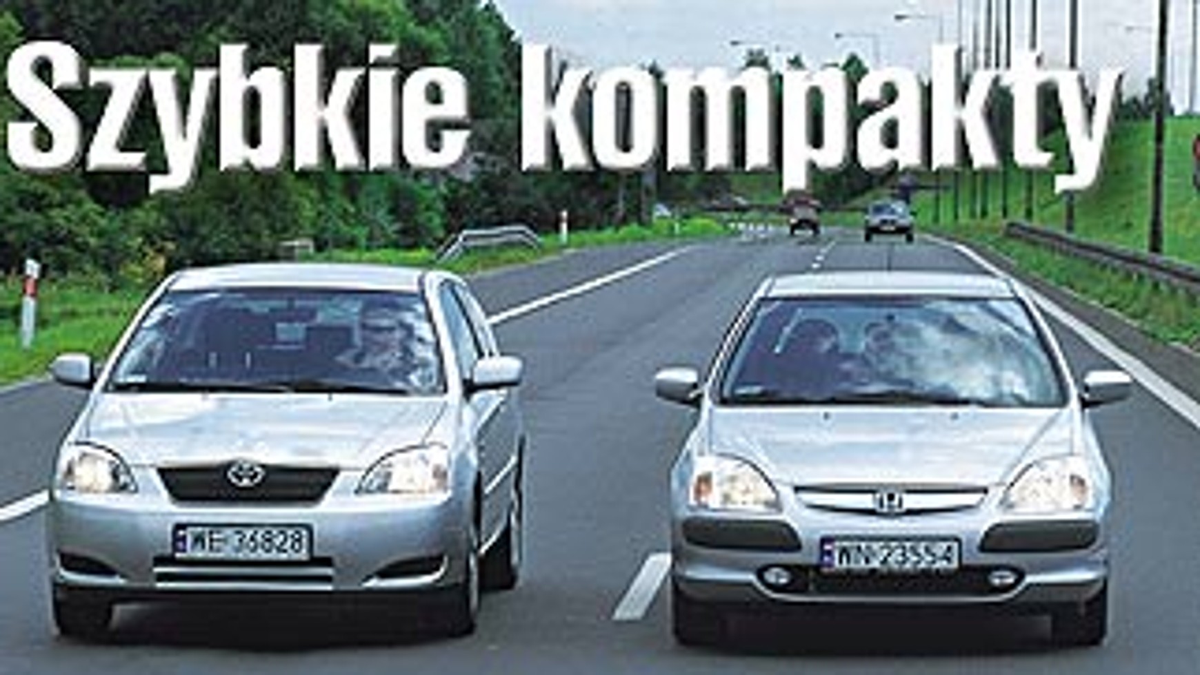 Należą do nowej generacji kompaktów, mają dynamiczną, sportową linię nadwozia. W przeciwieństwie do aut GTI - którymi jazda na co dzień jest męcząca ze względu na niski komfort jazdy (twarde zawieszenia) i duży hałas - mogą także posłużyć jako samochody rodzinne. Dłuższa, szersza i wyższa, a także mająca większy rozstaw osi Toyota zaskoczyła nas negatywnie mniejszą pojemnością bagażnika - jedynie 289 l. Konkurencyjny Civic oferuje o ponad 26 litrów większą pojemność. Corolla jednak może przewieźć cięższy bagaż (ładowność 525 kg). Vanopodobne kompakty zaskakują dobrą przestronnością wnętrza. Pełną, niczym nie ograniczoną swobodę ruchów, znajdziemy na przednich fotelach Hondy. Z tyłu również pasażerowie nie będą niezadowoleni. W Civicu jednak mogą dać się we znaki na długich trasach małe fotele. Mają dobre trzymanie boczne, ale ich siedziska są za krótkie. Takich powodów do narzekań nie znajdziemy z pewnością w Toyocie. Wyprofilowanie foteli przednich bez zarzutu, siedziska są nieznacznie dłuższe. Pasażerowie tylnej kanapy mają również sporo przestrzeni, choć nieco mniej niż w Civicu. Uporządkowana i ładnie wykończona deska rozdzielcza Toyoty mile zaskakuje. Jest czytelna (wskaźniki Optitron), przełączniki umieszczone na niej zostały poprawnie rozplanowane. Nie można mieć też zastrzeżeń co do jakości użytych materiałów, zwłaszcza że wersja Sol niektóre detale wykończone ma imitacjami aluminium. W dziedzinie ergonomii wnętrza trudno także wiele zarzucić Hondzie, zwłaszcza że lewarek skrzyni biegów jest umieszczony poręcznie w konsoli środkowej. Materiały są jednak uboższe, a koło kierownicy za cienkie. W obydwu autach zabrakło jednak regulacji kierownicy w dwóch płaszczyznach. Pocieszeniem są więc seryjnie oferowane w obydwu modelach radioodtwarzacze z CD. Fani szybkiej jazdy powinni być usatysfakcjonowani osiągami testowanych aut. 110-konne jednostki muszą napędzić zaledwie 1,1-tonowe pojazdy. W tej dziedzinie lepiej daje sobie radę Honda. Mimo identycznej masy i mocy dysponuje lepszą elastycznością i krótszymi czasami przyspieszeń. Ale różnica w stosunku do Corolli nie jest aż tak duża, by stwierdzić, że Toyota to auto wolne. Równomiernie rozwija moc i z łatwością wchodzi na obroty. Silniki japońskich aut to szesnastozaworowe konstrukcje, które świetnie czują się w wyższym zakresie obrotów. Dobrą elastycznością dysponują jednak już w niższym zakresie. To zasługa zastosowania w obydwu przypadkach zmiennych faz rozrządów (w Hondzie - VTEC, w Toyocie - VVTi). Szybsza Honda ma jednak pewien mankament. Powyżej prędkości 100 km/h jest hałaśliwa. Obsługa lewarków skrzyni biegów w obydwu autach zasługuje na pochwałę. W Civicu zmiana biegów przypomina zabawę dżojstikiem. Silnik Hondy jest bardziej elastyczny, a w dodatku okazał się oszczędniejszy. Civic podczas testu zużył mniej paliwa o 0,7 l/100 km. Osoby stawiające na pewne i bezpieczne prowadzenie, dla których mniej liczy się wysoki komfort jazdy, będą zadowolone. Zarówno Corolla, jak i Civic mają twarde nastawy zawieszenia. Toyota dzielnie daje sobie radę z niewielkimi nierównościami, za to z większymi może mieć kłopoty - słabo je wybiera i przenosi niewielki drgania na pasażerów. Z kolei podczas jazdy Civikiem zauważyliśmy, że auto ma tendencje do podskakiwania, a podczas zmiany obciążenia tył potrafi być nadsterowny. Niestety obydwa auta nie mają na liście wyposażenia opcjonalnego systemu kontroli stabilności ESP. Testowane auta nieźle wypadły w teście hamulców. Wynik w okolicy 40 m ze 100 km/h należy uznać za dobry. Toyota jednak wyróżnia się skuteczniejszym układem hamulcowym, jej droga hamowania jest krótsza niż Civica o prawie 2 metry przy hamulcach zimnych i rozgrzanych. Seryjnie japońskie auta wyposażone są w ABS i hamulce tarczowe, z przodu wentylowane.Dla zgrabnych, trzydrzwiowych kompaktów idealnym środowiskiem powinno być miasto. O ile Toyota dzielnie da sobie radę na ciasnych uliczkach czy zatłoczonych parkingach, o tyle z Civikiem możemy mieć poważne problemy. Jego średnica zawracania jest bowiem o ponad metr większa niż u konkurenta. Honda ma zbyt silnie wspomagany układ kierowniczy. Przy zawracaniu jest to zaleta, jednak przy szybkiej jeździe kierowca nie czuje zbyt pewnie auta. Toyota bez zarzutu - odznacza się dobrą precyzją prowadzenia. Japońscy producenci poważnie podeszli do tematu bezpieczeństwa. Seryjnie w obydwu modelach oferują cztery poduszki powietrzne i ABS. Szkoda jednak, że kurtyny powietrzne są niedostępne, nawet jako wyposażenie opcjonalne. Dla wszystkich pasażerów przewidziano także trzypunktowe pasy bezpieczeństwa i zagłówki. Za przyjemność jazdy mocniejszymi wersjami kompaktowych modeli japońscy producenci życzą sobie niemało. Toyota jest nieznacznie droższa od konkurenta, ma jednak lepsze wyposażenie: seryjną, automatyczną klimatyzację i komputer pokładowy. Warunki serwisu także skłaniają do wyboru Toyoty. Honda oferuje częstsze wizyty przeglądowe, a także tylko 6-letnią ochronę na perforację blach.