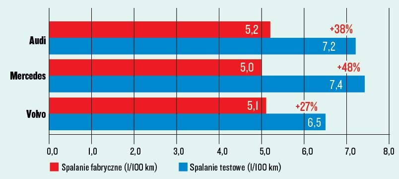 Pod względem uczciwości w podawaniu zużycia paliwa Volvo wypadło najlepiej, ale to nie znaczy, że dobrze. W teście spaliło prawie o jedną trzecią więcej, niż podaje producent. Audi w kwestii uczciwości katalogowych danych o spalaniu wypadło znacznie gorzej, a rekordzistą okazał się Mercedes, który podczas testu drogowego spalił o połowę więcej oleju napędowego niż w europejskich laboratoryjnych testach spalania, z których pochodzą dane fabryczne.