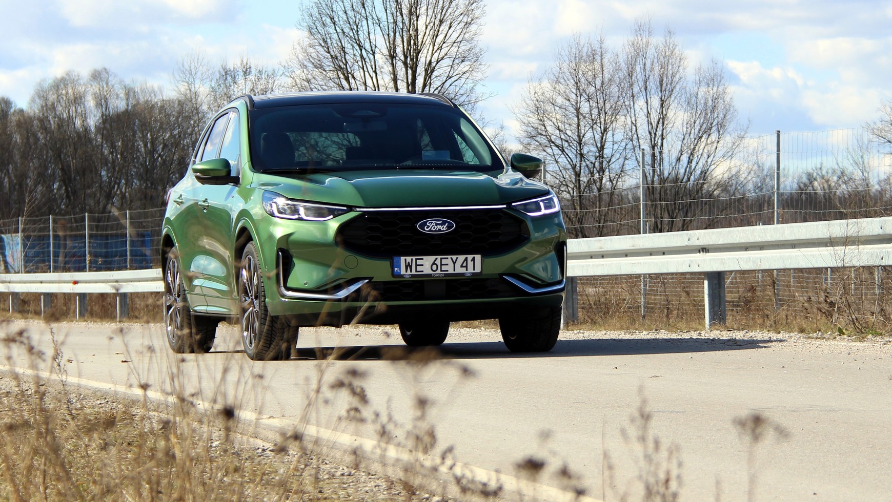 Jak to przy okazji face liftingu, największe zmiany zaszły z przodu samochodu. Ford Kuga otrzymał groźniejsze "spojrzenie" za sprawą nowych przednich reflektorów LED (matrycowe za dopłatą), szerszego grilla, na którym mieści się teraz logo marki, oraz inaczej wyprofilowanego zderzaka. Zgodnie z panującą modą, lampy połączono ze sobą listwą świetlną. Nowe są ponadto kolory lakieru (w tym Bursting Green jak w testowanym egzemplarzu) i wzory obręczy kół.