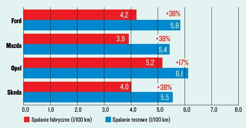 W dziedzinie ekonomii Opel się nie popisał, bo spalił najwięcej w teście. Ale za to uczciwiej traktuje klientów niż pozostałe marki, bowiem Insignia zużyła tylko o 17 proc. paliwa więcej, niż podano w katalogu. W przypadku konkurentów katalogowe „niedopowiedzenie” wynosi wstydliwe 38 proc.