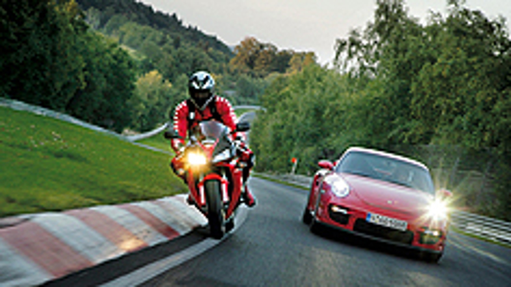 Klęka i dotyka dłonią jezdni, po czym mówi: "Suchy, ale jak tylko wzejdzie słońce, stanie się wilgotny. Mokrych miejsc nawet nie widać. Myślisz, że jedziesz po czarnym asfalcie, a tu nagle..." - w tym momencie Röhrl obraca gwałtownie wyimaginowaną kierownicą - "... dzieje się właśnie tak!". Za nimw czerwonym kombinezonie stoi Helmut Dähne. Uśmiecha się i kiwa głową. Walter Röhrl (61 l.), rajdowy mistrz świata, jest legendą sportów motorowych, a od 15 lat szefem zespołu kierowców testowych Porsche. Helmut Dähne (63 l.) 15-krotnie zdobył tytuł mistrza Niemiec w wyścigach motocyklowych. Ustanowił także rekord najszybszego przejechania "pętli północnej". Zacznijmy pojedynek mistrzów. Sprawdźmy w końcu, co jest szybsze: samochód czy motocykl? Który pojazd lepiej sprawdza się na zamkniętym torze? Czy korzystniejszy stosunek mocy do ciężaru niż w Porsche (530 KM przy 1440 kg) da Hondzie (172 KM przy 205 kg) zwycięstwo?{player}1203603022303.flv{/player}Czy większe znaczenie będzie miała około 20-krotnie większa powierzchnia kontaktu auta z jezdnią niż w przypadku motocykla? "Trochę się obawiam, że ciężko będzie pokonać Waltera w GT2" - mówi Helmut Dähne, zakładając buty. Kilka metrów dalej prawdopodobnie najlepszy niemiecki kierowca rajdowy elegancko zasiada za kierownicą czerwonego Porsche GT2. Jeździł nim po "pętli północnej" przez półtora roku ponad kilkanaście razy, za każdym razem zmieniając nastawy zawieszenia. "Kolega komputer - mówi Röhrl - robi dobrą robotę. Prototyp, który dostałem do objechania, jest już prawie doskonały, tak w 90 procentach". Zadaniem Röhrla jest zbudowanie pojazdu sportowego, który nawet w sytuacjach ekstremalnych byłby tak łagodny, jak tylko może być tak mocne monstrum. "Przejście od przyczepności do jej utraty powinno być płynne" - mówi Röhrl.Gdy powoli wjeżdża na tor, słońce właśnie zaczyna wyglądać sponad wierzchołków drzew. GT2 brzmi zadziwiająco łagodnie w porównaniu z GT3, niewyposażonym w turbodoładowanie. Röhrl rusza gwałtownie, błyskawicznie się rozpędza, pokonując zakręt w lewo Schwedenkreuz z prędkością 270 km/h! Potem Fuchs-röhre w dół i dalej Kurvengestangel także na pełnym gazie. Następnie dojeżdża do Sprungkuppen i w końcu pokonuje Schwalbenschwanz, który tak kocha. Na Döttinger Höhe Röhrl przyspiesza do prędkości 302 km/h. "GT2 ma niesamowity ciąg już od niskich obrotów. Nawet od 1950" - powie później. Porsche było na mecie po 7:32,18 minuty. Dähne coś mruczy pod nosem, co brzmi jak: "Nie do wiary!". Helmut Dähne zna Waltera Röhrla od początku lat osiemdziesiątych ubiegłego wieku. Wtedy właśnie Röhrl trenował na Nürburgringu na motocyklu Bimota SB3. Dahne był jego nauczycielem. Jednak dwa kółka zawsze wydawały się Röhrlowi zbyt niebezpieczne. Twierdził, że wypadek na motocyklu jest tylko kwestią czasu. Po czterech miesiącach postanowił sprzedać motor. Dähne od dziecka kocha motocykle.W wieku 21 lat po raz pierwszy jechał na dwóch kółkach po "pętli północnej" Nürburgringu, a w 1993 roku ustanowił motocyklem rekord toru - 7:49,72 minuty. W międzyczasie pokonał tę pętlę kilka tysięcy razy. Skupiony podchodzi do ognistoczerwonego supermotocykla. Teraz musi dać Walterowi Röhrlowi zdecydowaną odpowiedź. Jednak szybko okazało się, że na torze o długości 20,8 km ze wzniesieniami i dolinami motocykl nie ma szans. Nie może hamować równie skutecznie jak samochód oraz pokonywać zakrętów z podobnie wysoką prędkością z powodu cienkich opon (z przodu 120 mm, z tyłu 190 mm). Choć według danych motocykl ma lepsze przyspieszenie, to jednak tylko teoria. Niezbędny jest przyczepny i prosty odcinek bez wzniesień. Pod górę Honda była gorsza od Porsche pomimo korzystniejszego stosunku masy do mocy. "Trzeba bardzo uważać, żeby się nie przewrócić albo nie polecieć" - mówi Dähne. Jego wymaltretowane plecy mogłyby powiedzieć jeszcze więcej. Na Döttinger Höhe osiągnął na krótko prędkość 257 km/h. "Kiedyś - mówi - bardzo szybka jazda motorem sprawiała frajdę. Dzisiaj jestem już ostrożniejszy. To bardziej walka." Czas przejazdu motocyklem wyniósł8:12,62 minuty. Stało się jasne, że w takich samych warunkach i przy tak samo dobrych kierowcach auto jest szybsze na torze wyścigowym. Przegrany pogratulował zwycięzcy, jednak było jasne, że Walter Röhrl odczuwał bardziej ulgę niż radość. Ulgę, że Dähne cały i zdrów zsiadł z Hondy CBR 1000. Röhrl otwarcie mówi, że jego zdaniem jazda motocyklem po "pętli północnej" to nieporozumienie. Obietnicę rewanżu kwituje śmiechem. Helmut Dähne tak podsumował wyścig: "Dobry motocyklista jest o wiele szybszy na