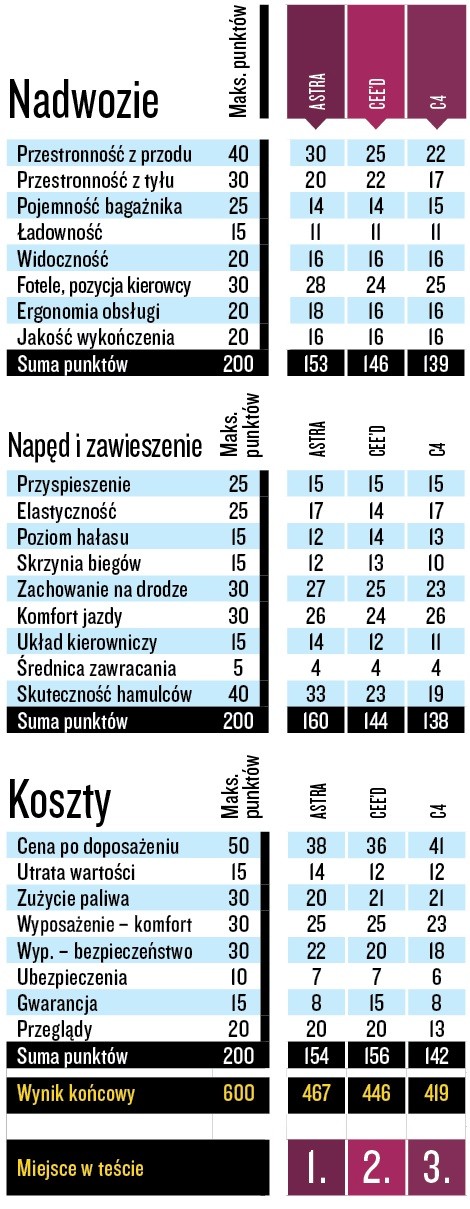 Mimo najwyższej ceny po doposażeniu i największej utraty wartości Kia wygrywa kategorię „koszty” – zawdzięcza to 7-letniej gwarancji. Gdyby Opel pokusił się o więcej niż marne 2 lata ochrony, miałby komplet zwycięstw. Ale i bez tego wygrał to porównanie z dużą przewagą punktową. Citroënowi brakuje wiele nowoczesnych elementów wyposażenia, dlatego także tę dziedzinę oddaje walkowerem. Najniższa cena niewiele jest w stanie tu zmienić, w dodatku „C-czwórką” trzeba jeździć najczęściej na przeglądy.