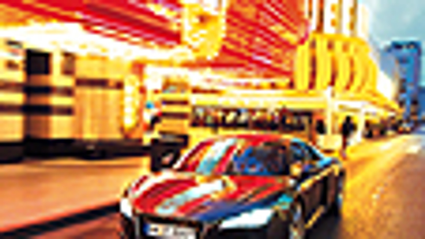 R8 wystrzeliwuje z miejsca z pełnym furii rykiem, przenosząc cię w wymiar dla Audi dotychczas nieznany. 4,6 s ma temu aluminiowemu atlecie wystarczyć na rozpędzenie się do 100 km/h. Przy 301 jest koniec. Po tym przeżyciu chętnie uwierzysz w obietnice producenta. Opony 235 z przodu i 285 z tyłu z dziką determinacją rwą asfalt, podczas gdy seryjnie instalowane układy elektroniczne chronią je przed ulotnieniem się z dymem. Przy 4 tys. obr./min zabawa zaczyna się na dobre, a jazda R8 z każdym kilometrem sprawia większą frajdę. Drogi wokół Las Vegas pozwalają wypróbować układ jezdny R8 - sztywny, bezpieczny i kochający łuki. Standardowe zawieszenie jest na tyle dobre i na dodatek relatywnie komfortowe, że opcjonalny system regulacji Dynamic Ride wydaje się zbędny(wyposażone tak R8 jest wprawdzie niewrażliwe na wszelkie ruchy nadwozia, ale i bezlitośnie twarde). Bezpośredni układ kierowniczy zdaje się sam znajdować idealny tor, rozkład masy 44 do 56 zapewnia starannie wyważoną radość z jazdy, a napęd quattro gwarantuje bardzo sprawne połykanie zakrętów.