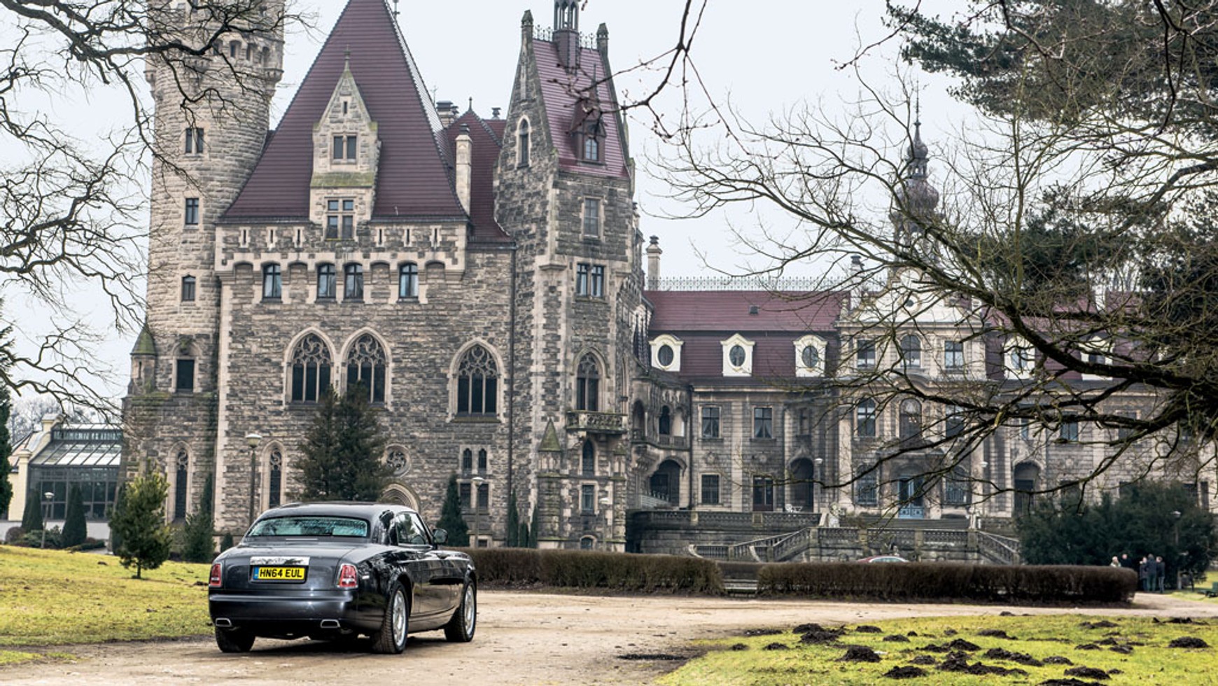 Choć Phantom Coupé na ulicach Warszawy pewnie wyglądałby efektownie, my postanowiliśmy dać mu odetchnąć innym powietrzem. Godne tło dla naszej sesji znaleźliśmy w zamku w Mosznej. Ta posiadłość na Opolszczyźnie, z korzeniami sięgającymi XVII wieku, była wielokrotnie przebudowywana, stąd tyle w niej neogotyckich akcentów. Te elementy jak żywo przypominają mroczne zamczyska w Wielkiej Brytanii.