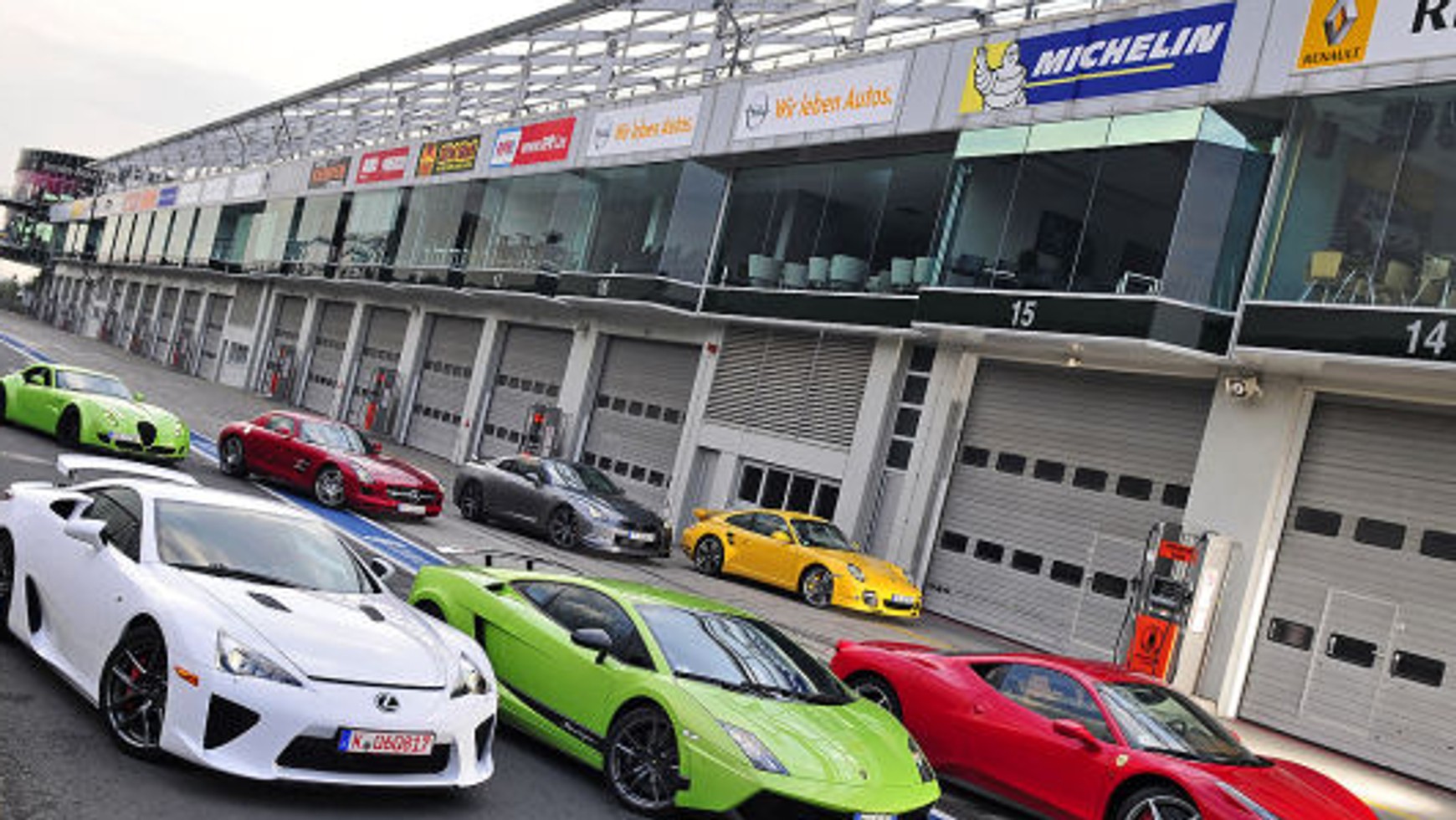 # Na casting przybyli (od prawej): Porsche 911 Turbo S, Nissan GT-R, Lamborghini Gallardo LP 570-4 Superleggera, Ferrari 458 Italia, Lexus LFA, Mercedes SLS AMG, i Wiesmann GT MF5.