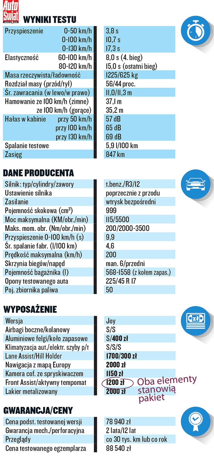 Producent zapowiada, że auto wyposażone w tę jednostkę będzie spalać średnio 4,6 l/100 km. O tym, że dane firm są uzyskiwane na podstawie laboratoryjnego testu i zazwyczaj nijak się mają do drogowych pomiarów, wiadomo od dawna. Mimo to średnie testowe zużycie na poziomie 5,9 l/100 km w aucie o tej wielkości i masie należy uznać za więcej niż przyzwoite. Sytuacja skomplikuje się nieco, gdy zaczniecie mocniej wykorzystywać możliwości jednostki. Spalanie będzie wówczas szybko rosnąć i w mieście może się zbliżyć nawet do 10 l/100 km – wysilone małe silniki są po prostu bardziej podatne na styl jazdy i trzeba być tego świadomym.
