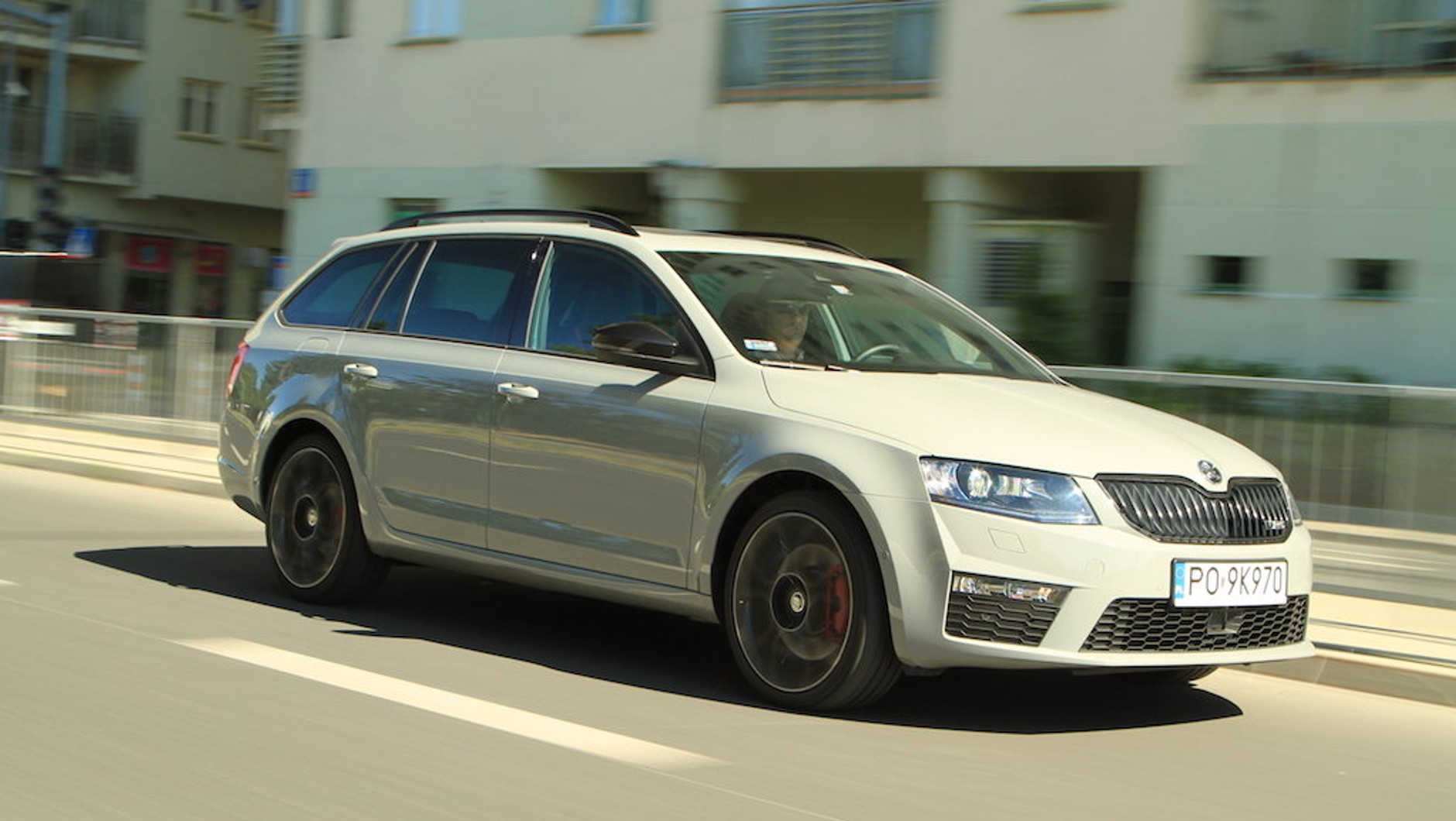 Kombi, szary lakier – to jednoznacznie kojarzy się z przeciętnym autem dla rodziny. Ale zaraz, zaraz takie postrzeganie Skody Octavii zmienia się gdy zwrócimy uwagę na efektownie wyglądające czarne alufelgi (przy tym lakierze wyglądają trochę jak kwiatek przy kożuchu). Rzut oka na atrapę chłodnicy wszystko wyjaśnia – w tym przypadku mamy do czynienia z modelem RS. Jakby tego było mało nie jest to znana do tej pory wersja z 220-konnym silnikiem, lecz Skoda Octavia RS 230, której silnik generuje właśnie 230 KM, a w standardzie jest elektronicznie regulowana blokada mechanizmu różnicowego przedniej osi.