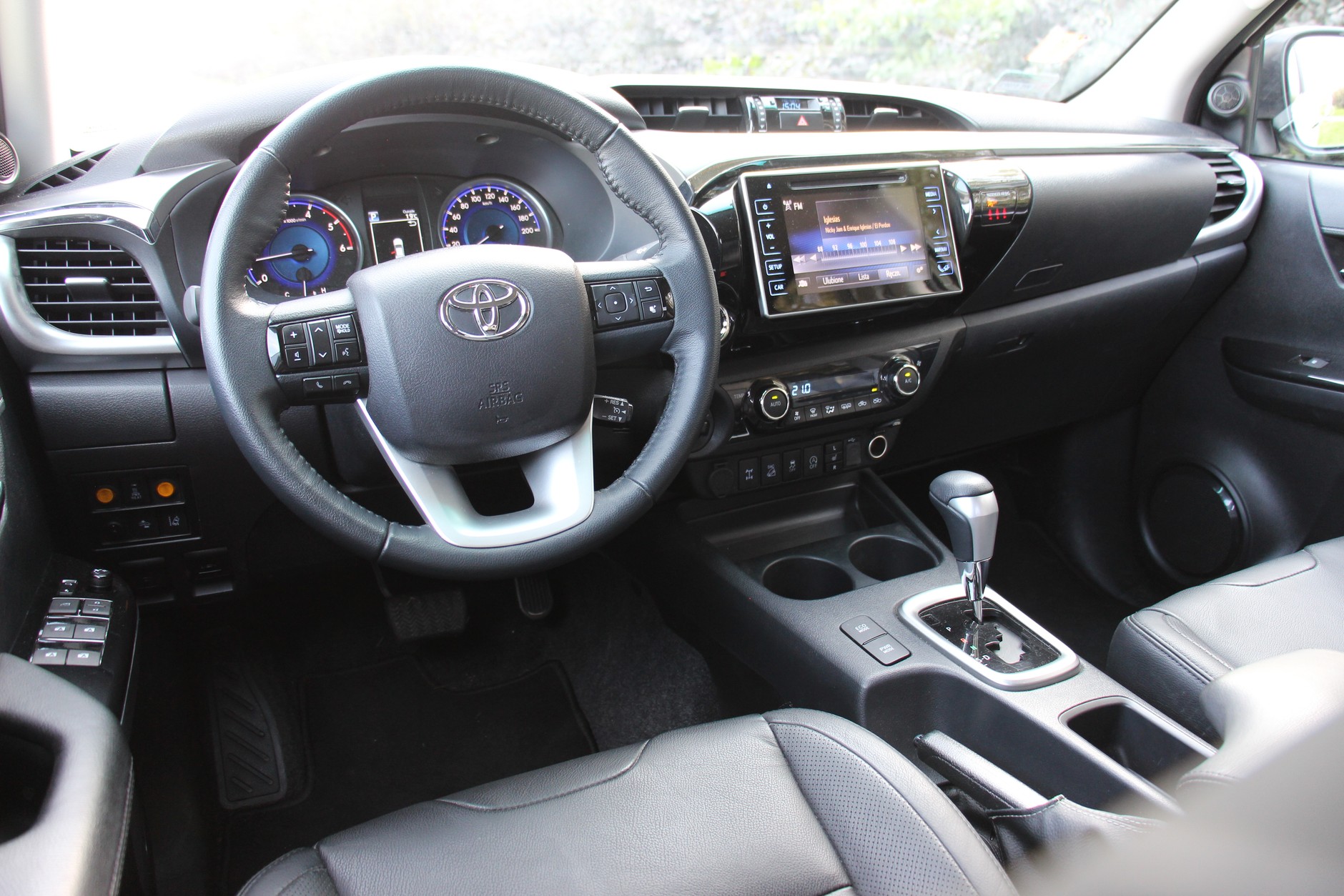 Już na wstępie mogę uspokoić, że Hilux, który uchodził za niezniszczalną maszynę w stylu Johna Rambo, bynajmniej nie nabrał manier Jamesa Bonda. Po prostu stał się nieco bardziej wszechstronny. Kierunek zmian zdradza już na pierwszy rzut oka chromowana atrapa chłodnicy. Otwieram drzwi i nie jestem zaskoczony. Wnętrze utrzymane jest w typowym dla pick-upa Toyoty stylu, choć nie brakuje tu dużego centralnego wyświetlacza oraz bogatego wyposażenia związanego z bezpieczeństwem. W najbogatszych wersjach znajdziemy również przyjemną w dotyku skórę na fotelach. Poprawiono również pozycję za kierownicą.