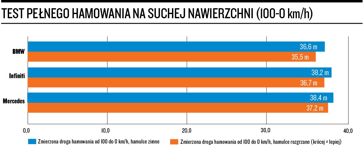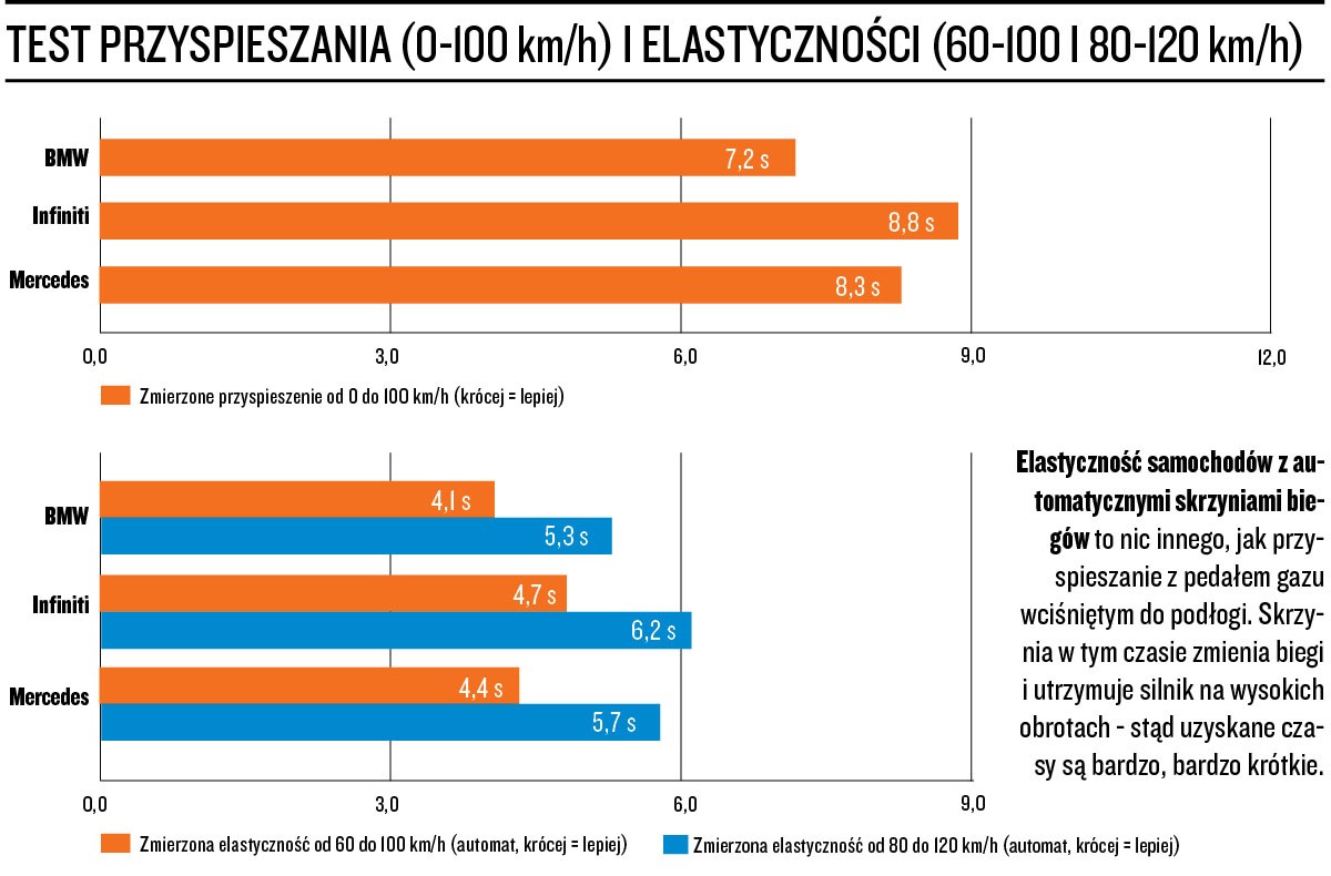 Infiniti dzieli 2,2-litrowego diesla i 7-biegową, dwusprzęgłową przekładnię z Mercedesem. Rozwija jednak moc 170 KM, podczas gdy klasa A ma już nowszy, 177-konny wariant. Ponieważ „japończyk” waży najwięcej (1672 kg), osiągami przegrywa ze swoim kuzynem ze Stuttgartu. W trakcie przyspieszania w zakresie 0-130 km/h traci do A 220d ponad sekundę, a do 120d – nawet blisko 3 sekundy!