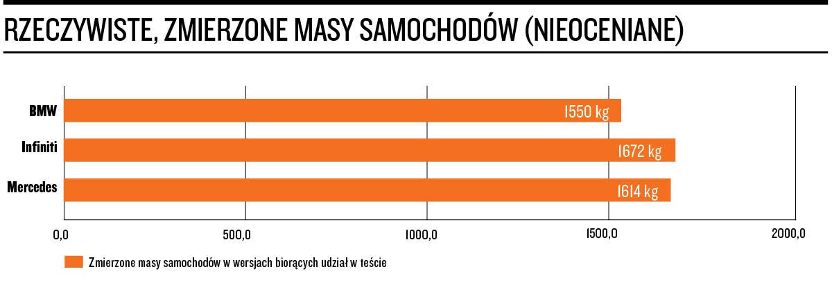 Powodem do wstydu jest także widoczność. Tylko „jedynka” oferuję w miarę akceptowalne przeszklenie i panoramę na otoczenie auta. Q30 jest pod tym względem najgorsze – zamiast okien mamy tu wizjery. Tylnej szyby równie dobrze mogłoby nie być i (prawie) tyle samo byłoby widać. Naprawdę imponuje za to wyposażenie. Q30 ma na pokładzie liczne udogodnienia, które wymagają dopłaty u niemieckich konkurentów. Myślicie, że tak "napakowane" dobrodziejstwami Infiniti waży więcej od rywali? Oto, co pokazała nasza waga: