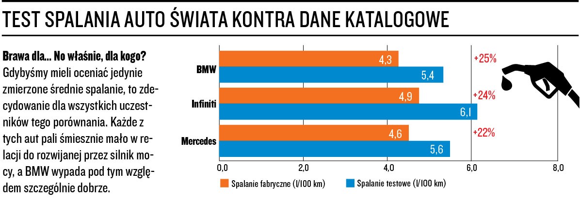 Oto bowiem BMW, które dzięki dwulitrowemu silnikowi wymyka się wysokiej akcyzie, wcale nie jest najtańsze – ten laur przypada w udziale Infiniti. Mercedes wypada drożej od swojego japońskiego „brata”. Równie ciekawe jest porównanie utraty wartości trzech testowanych samochodów, które znajdziecie w tabelce na końcu materiału.