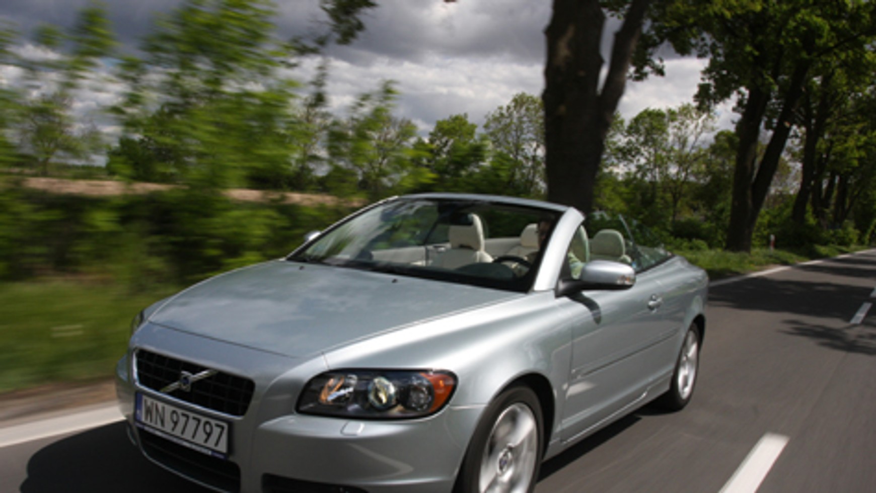 Szpan jest na tyle duży, że decydujemy się na razie dachu nie składać. Volvem C70 jedzie się przyjemnie, do ok. 100 km/h przednie siedzenia są świetnie osłonięte od wiatru. Dobre nagłośnienie nie przestaje być słyszalne, a wnętrze, choć ciasne, daje uczucie komfortu dzięki ładnemu skórzanemu wykończeniu. Denerwuje tylko kierownica, która jest niby skórzana, a jakby plastikowa. Po pierwszych kroplach deszczu zatrzymujemy się, rozkładamy dach (bo szkoda tapicerki) i zauważamy, że z wnętrza auta niewiele widać. Niski dach i słupki tak ograniczają widoczność, że łatwo o przeoczenie znaków drogowych.