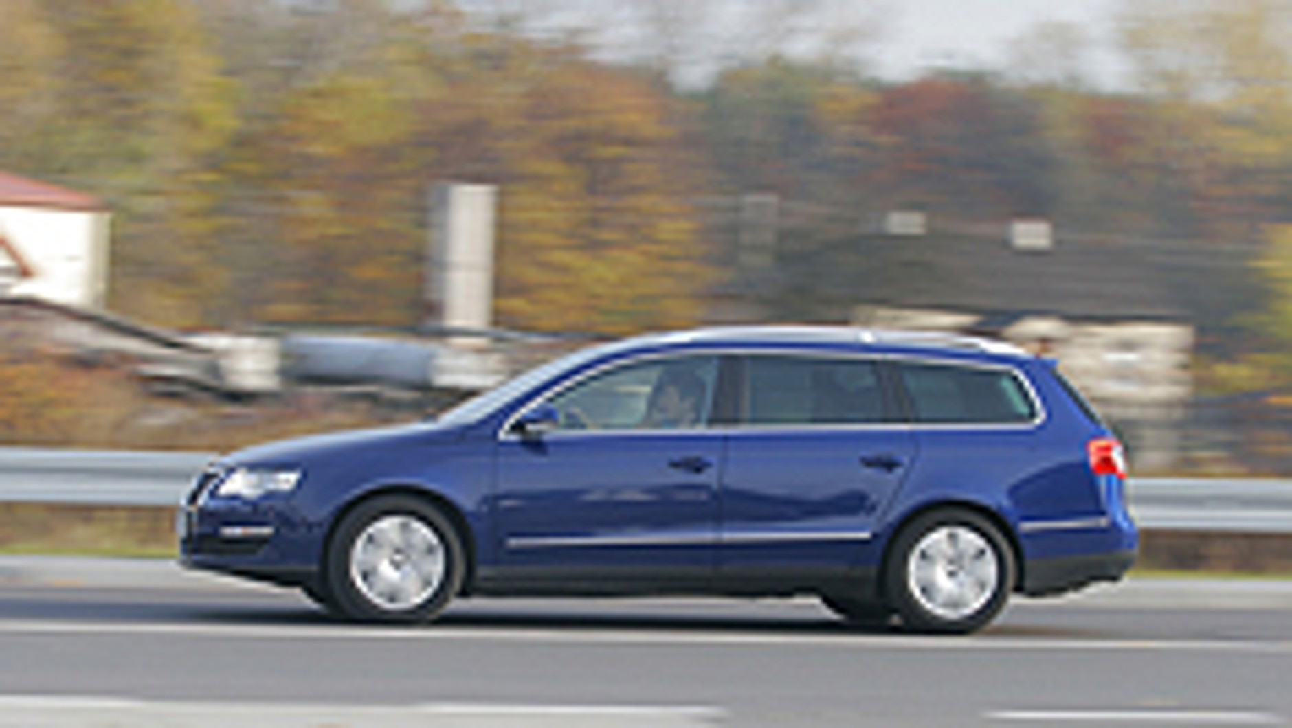 Teoretycznie model ten ma największy bagażnik w segmencie D. 603 l to jedynie wymysł producenta, bo wynik naszego testu ("AŚ" nr 48/07) pokazał, że rzeczywista jego pojemność to 508 l. Pod maską testowego auta znalazł się znany, 2-litrowy turbodiesel zasilany pompowtryskiwaczami.Trzeba przyznać, że sprawnie napędza ważącego 1,6 tony kolosa. Samochód ma dobrą elastyczność i co ważne niewygórowane spalanie. Jedynym jego mankamentem jest niezbyt miły dla ucha dźwięk pracy silnika TDI. Podwozie Passata jest sztywno zestrojone, co jednak nie znaczy, że auto okazuje się mało komfortowe. Samochód pewnie pokonuje kręte odcinki drogi, a seryjne ESP na szczęście nie ma zbyt dużo pracy. Układ kierowniczy ma dobrą precyzję, choć kierujący wyraźnie czuje, że prowadzi duże i ciężkie auto. Nasz Passat nie popisał się skutecznością hamulców.Zarówno przy zimnym, jak i rozgrzanym układzie pojazd zatrzymywał się ze 100 km/h do "zera" na dystansie prawie 40 m. Cena testowego egzemplarza jest wysoka, ale nie należy zapominać, że jest to topowa wersja Highline, oferująca bogate wyposażenie (m.in. 6 airbagów, system ESP, Climatronic, tempomat, czujniki deszczu i świateł, tapicerkę z alcantary). Konkurenci w topowych wersjach kosztują podobnie.