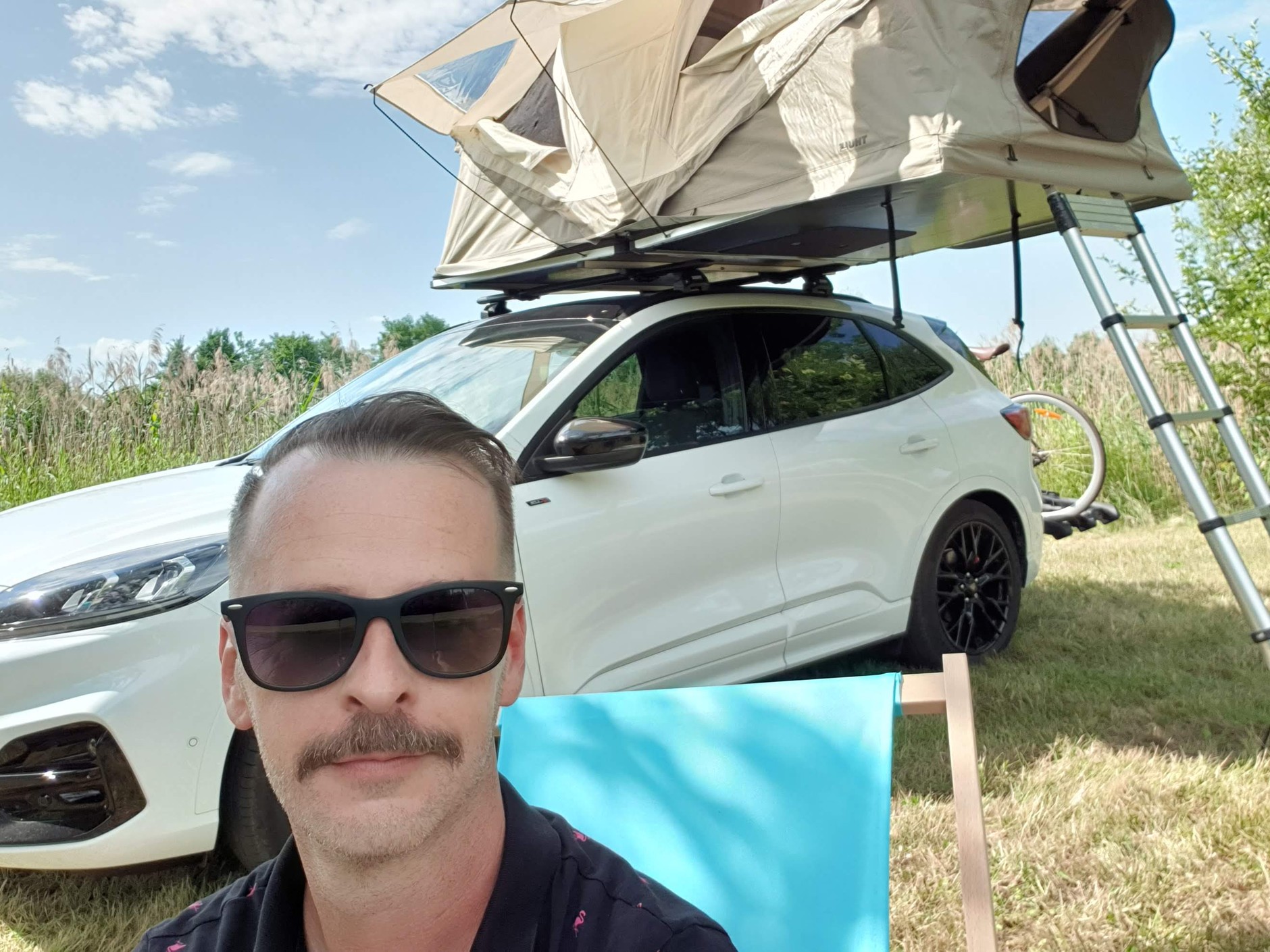 Ford ma własny sposób na połączenie wody z ogniem, czyli w tym przypadku na kampera, który jest jednocześnie całkiem zwykłym samochodem. To Forda Kuga w odmianie hybrydowej, a dokładniej — Kuga FHEV z pakietem ST-Line X Black doposażona w wyprawowy zestaw w postaci namiotu dachowego Thule Approach oraz bagażnika rowerowego Thule Epos. Inaczej, niż w niedawno testowanej przez nas Dacii Jogger, Ford nie postawił więc na wewnętrzny wkład, ale na akcesoria kempingowe mocowane na zewnątrz samochodu.