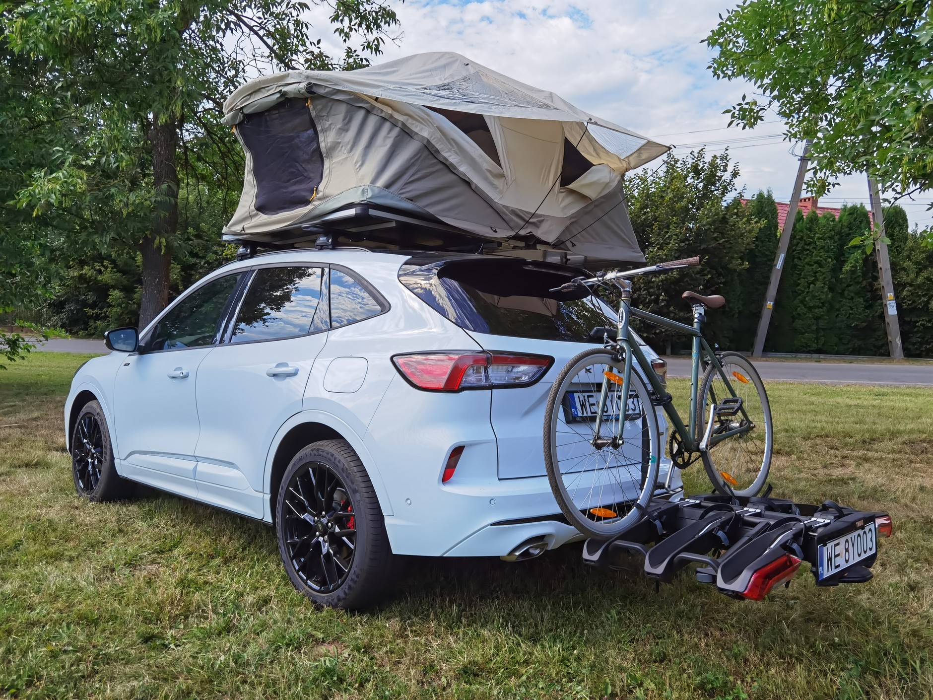 A jak się z tym wszystkim czuje hybrydowy Ford Kuga? Wygląda na to, że znakomicie, co zresztą najlepiej widać po średnim spalaniu, jakie udało się uzyskać podczas tygodnia jazdy. Bez specjalnego starania się podczas prawie 500 km trasy (warunki tzw. miejsko-podmiejskie, czyli część trasy w mieście, a część na trasach dojazdowych, w tym na krótkich odcinkach ekspresówek i autostrad) przeciętnie było to tylko 6,5 l/100 km. Biorąc pod uwagę, że to spory SUV, i do tego akurat w tym przypadku dość wysoki, bo z namiotem na dachu ma łącznie 2,10 m, jeżdżący przez większość czasu z bagażnikiem rowerowym (zarówno namiot, jak i bagażnik zdecydowanie nie poprawiały aerodynamiki auta), to jest całkiem niezły wynik, powiedziałbym nawet, że bardzo dobry. Trzeba tylko zaznaczyć, że maksymalna prędkość Kugi z namiotem na dachu to ze względów bezpieczeństwa 130 km/h.