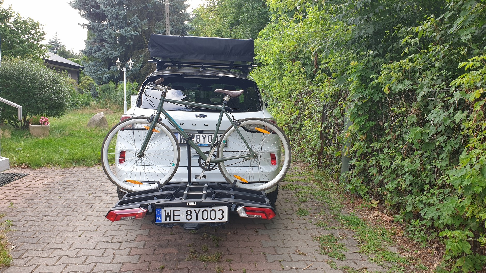 Fajnym i praktycznym dodatkiem, zresztą nie tylko wyprawowym, jest bagażnik rowerowy Thule Epos. W tym przypadku sprawdziłem, jak szybko się go zakłada — Kuga z bagażnikiem mieściła się "na styk" na miejscu parkingowym, poza tym wolałem, aby nikt przez przypadek o niego nie zahaczył. Cały montaż to zapięcie bagażnika na haku w odpowiedniej pozycji, dociśnięcie mocującej go dźwigni (i zamknięcie jej na kluczyk) i wpięcie wtyczki.